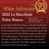 この[2022]年でワインアドヴォケイト誌驚異の93点高評価で、コメントは「レ・マッキオーレの2022年パレオ・ビアンコ(主にシャルドネを主体に、ソーヴィニヨン・ブランが補助的な役割を果たすブレンド)は、果樹園の果物と白桃の豊かな香りに、ゴールデン・デリシャスリンゴ、砕けた石、甘く煮詰めたタンジェリンの繊細なアクセントが加わります。香りは完全に開くことはありませんが、全体に十分なテクスチャーと構造を備えています。最終的に、パレオ・ビアンコは鼻よりも口に訴えるワインです。2022年に、2021年ヴィンテージのパレオ、スクリオ、メッソリオを樽から試飲しました。当時、最初のレビューを公表しましたが、ワインに点数を付けませんでした。今日、これらのボトルに公式な数値評価とワインノートを添えて戻ってくるのは、喜びです。」!