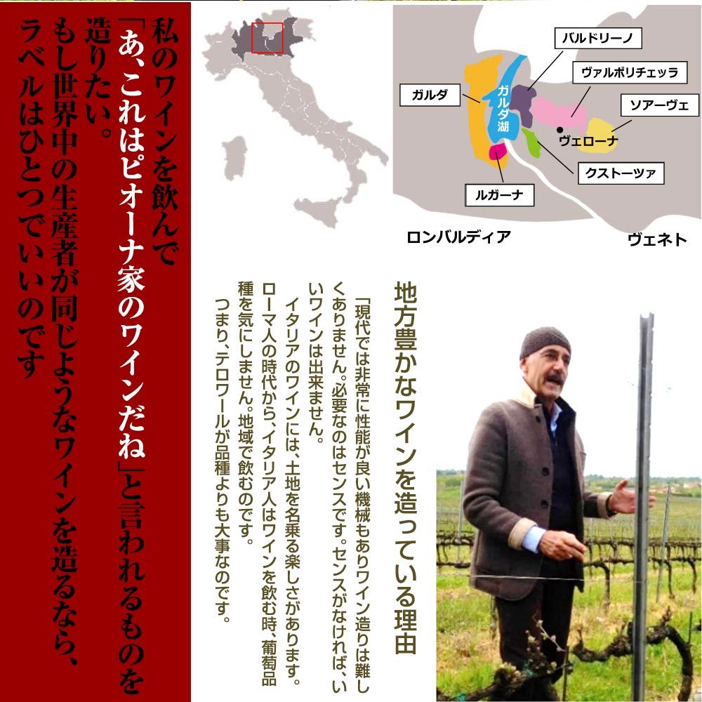 ヴェローナの多くのレストランでワインリストに載せられています。また、カヴァルキーナ(ピオーナ)のワインを扱い出して20年以上になりますが、ヴィンテージによる品質のバラツキは皆無といってよく、その安定感には絶大な信頼をよせることが出来ます。