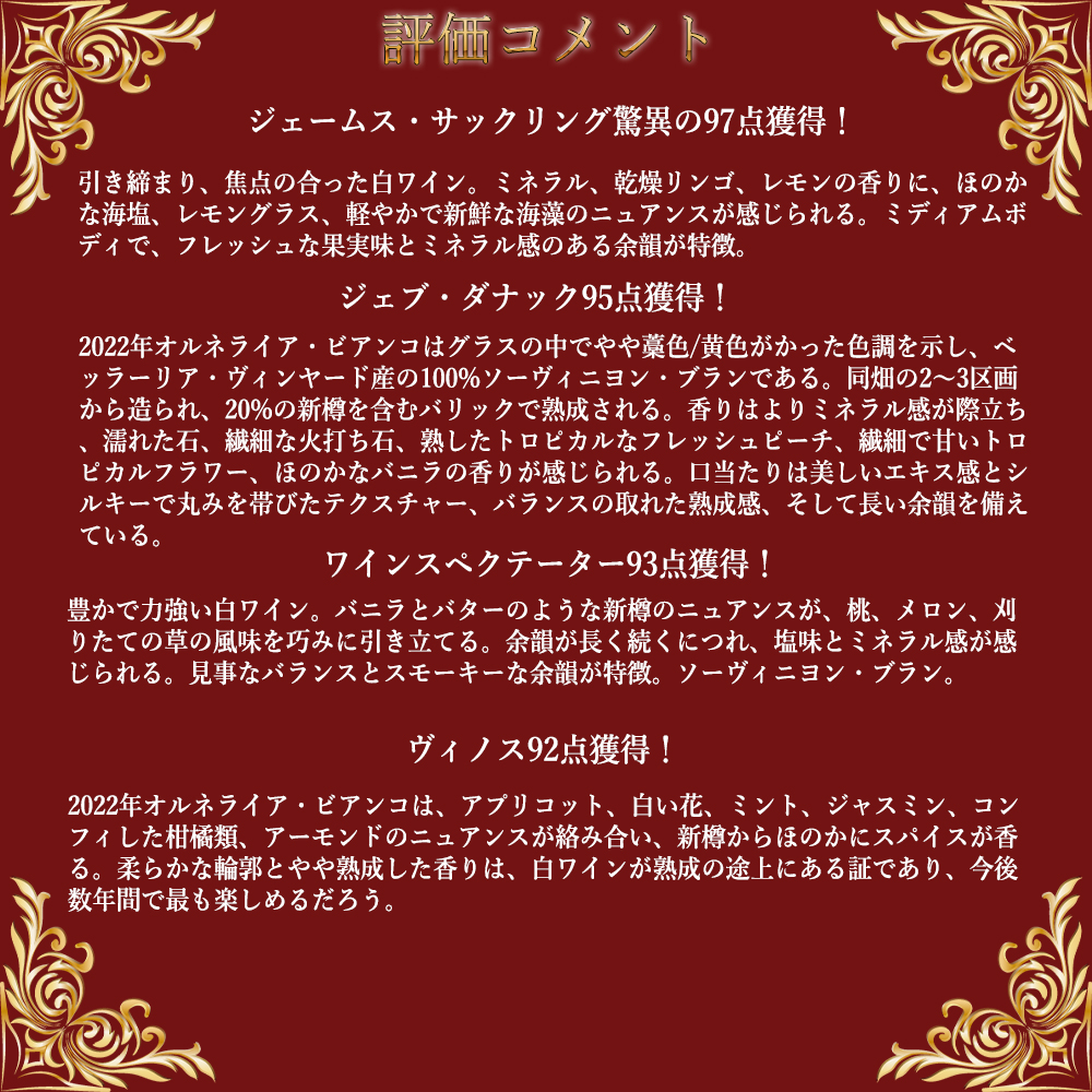 ジェブ・ダナック95点でコメントは「2022年オルネライア・ビアンコはグラスの中でやや藁色/黄色がかった色調を示し、ベッラーリア・ヴィンヤード産の100%ソーヴィニヨン・ブランである。同畑の2~3区画から造られ、20%の新樽を含むバリックで熟成される。香りはよりミネラル感が際立ち、濡れた石、繊細な火打ち石、熟したトロピカルなフレッシュピーチ、繊細で甘いトロピカルフラワー、ほのかなバニラの香りが感じられる。口当たりは美しいエキス感とシルキーで丸みを帯びたテクスチャー、バランスの取れた熟成感、そして長い余韻を備えている。」!