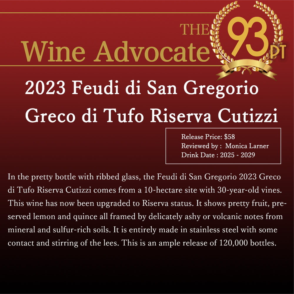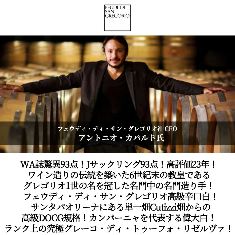 “クティッツィ”グレコ・ディ・トゥーフォ・リゼルヴァ[2023]年・フェウディ・ディ・サン・グレゴリオ元詰・数量限定輸入品グレコ種100%・DOCGグレコ・ディ・トゥーフォ・リゼルヴァ・手摘み100%・単一畑産・正規品・ワインアドヴォケイト誌驚異の93点&ジェームス・サックリング93点&ファルスタッフ93点高評価
