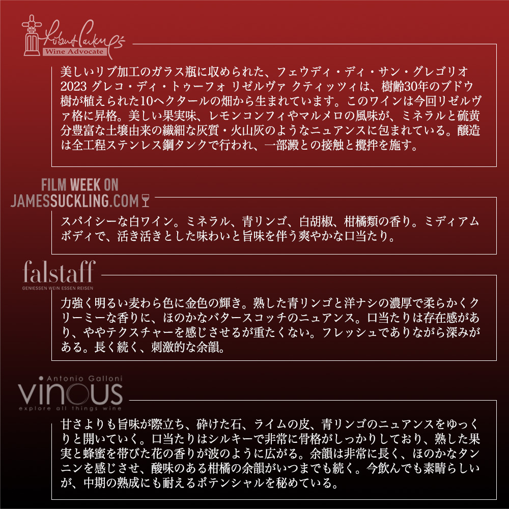 しかも造り手はロバート・パーカー満点★★★★★5つ星生産者であり、2023年のクティッツィでワインアドヴォケイト誌驚異の93点でコメントは「美しいリブ加工のガラス瓶に収められた、フェウディ・ディ・サン・グレゴリオ 2023 グレコ・ディ・トゥーフォ リゼルヴァ クティッツィは、樹齢30年のブドウ樹が植えられた10ヘクタールの畑から生まれています。このワインは今回リゼルヴァ格に昇格。美しい果実味、レモンコンフィやマルメロの風味が、ミネラルと硫黄分豊富な土壌由来の繊細な灰質・火山灰のようなニュアンスに包まれている。醸造は全工程ステンレス鋼タンクで行われ、一部澱との接触と攪拌を施す。」!