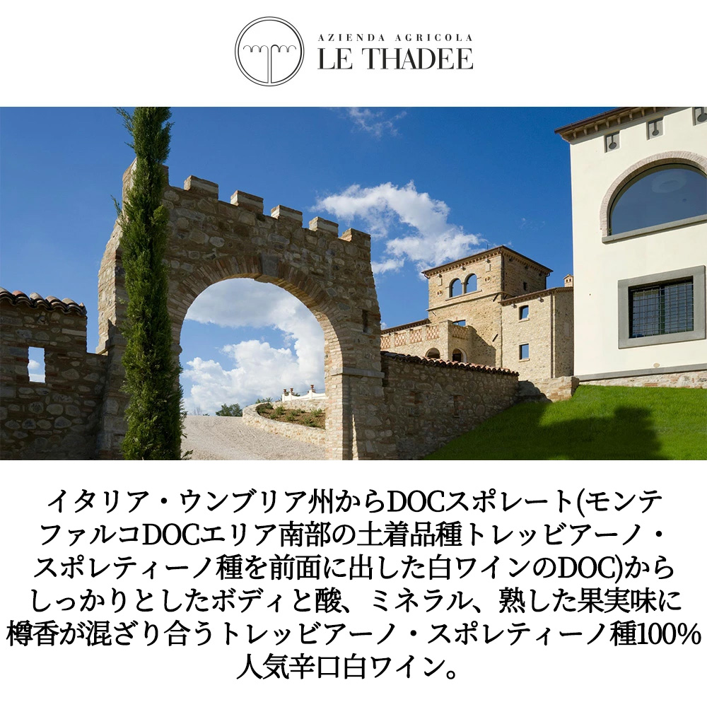 イタリア・ウンブリア州からしっかりとしたボディの辛口白ワイン愛好家大注目!!しかも土着品種トレッビアーノ・スポレティーノ種で造る、こだわりの1本。しっかりとした酸、ミネラル、熟した果実味に樽香が混ざり合う人気辛口白ワイン。しかもトレッビアーノ・スポレティーノ種をタンクと樽で熟成させた上級作品!イタリア・ウンブリア州・スポレート村・DOCスポレートと言えばモンテファルコDOCエリア南部と連続しており、同地域の土着品種を前面に出した白ワインのDOCという位置づけです。Spoleto Trebbiano Spoletino DOCは土着のトレッビアーノ・スポレティーノ種を最低85%(このワインは100%)使用するスペシャルキュヴェ。フレッシュで親しみやすい香り、口中ではしっかりとしたボディと長い余韻を持ち、若飲みも長期熟成も両方に向きます。