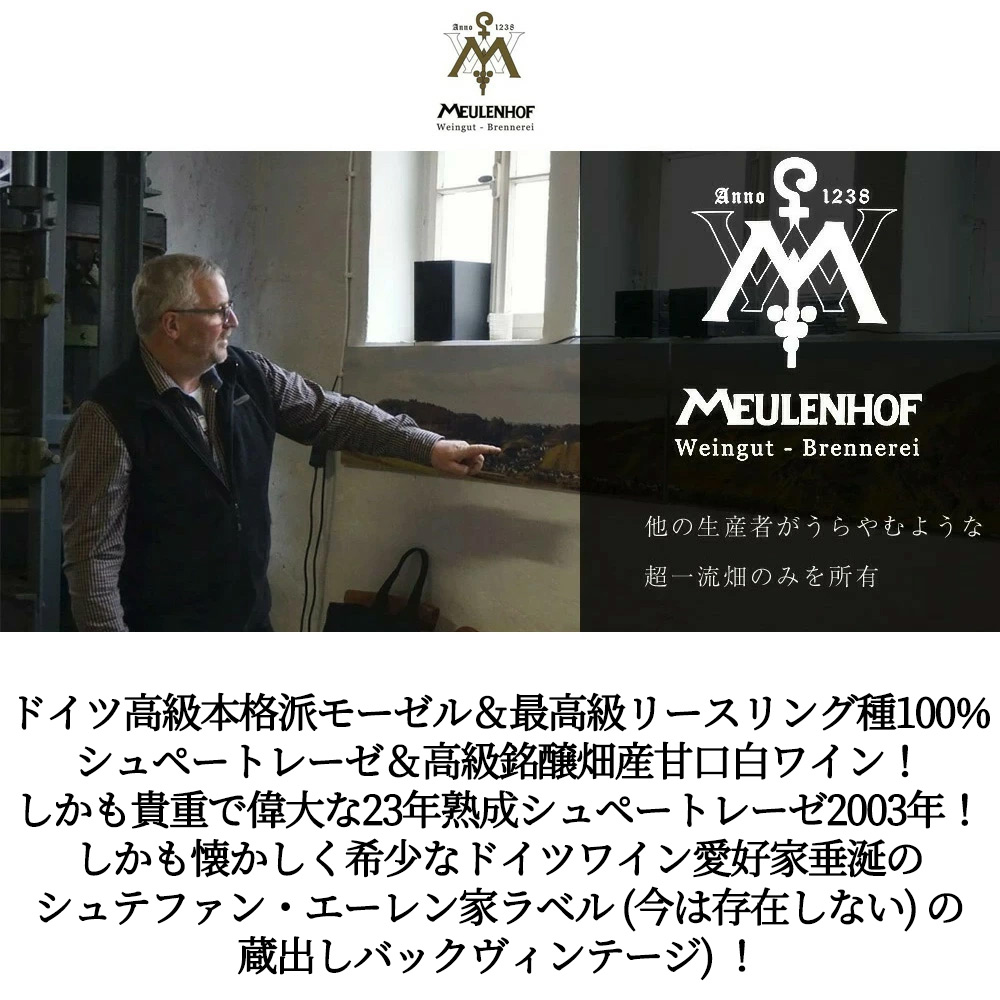 エルデナー・トレプヒェン・シュペートレーゼ[2003]年・生産者蔵出し限定秘蔵作品・シュテファン・エーレン家(モイレンホフ・(ミューレンホーフ)(ステファン・ユステン家)元詰)・8.5%・23年熟成作品(懐かしく希少なドイツワイン愛好家垂涎のシュテファン・エーレン家ラベル(今は存在しない)の蔵出しバックヴィンテージ)(2025年11月正規代理店輸入品)