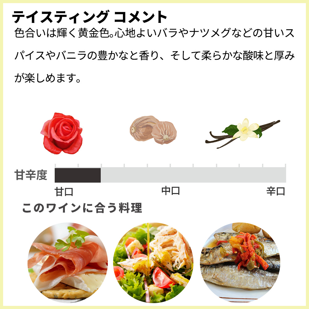 色合いは輝く黄金色。心地よいバラやナツメグなどの甘いスパイスやバニラの豊かなと香り、そして柔らかな酸味と厚みが楽しめます。適温:10-12度 生ハムやサラミ等の前菜類、ベトナム料理や韓国、中華料理やエスニック料理にお勧め。