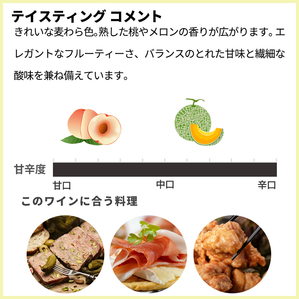 きれいな麦わら色。熟した桃やメロンの香りが広がります。 エレガントなフルーティーさ、バランスのとれた甘味と繊細な酸味を兼ね備えています。