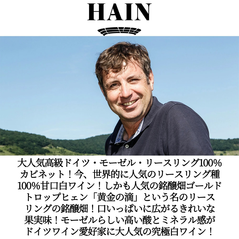 1800年の初頭 (教会の司祭から買い取った) から歴史があり、350年前からのセラーを使用してワイン造りを行うハイン家 (オーナー、ゲアノット・ハイン氏と妻のスザネと子ども2人) の元詰ワイン!しかも中央モーゼルの指折りの高級畑!しかも最良の芳醇なアロマに富み、壮麗なリースリングとして定評!ハインでは、ゴールドトロップヒェン カビネットの区画を決め、真南から少しずれた場所の葡萄を使用しています!そしてフレッシュな味わいが大切と考え、他の葡萄より早めに収穫します!また、カビネットと決めていない区画でも、カビネットに適した葡萄は先に収穫して使います!結果、残りの葡萄の糖度がより高くなる間引きの効果もあります!醸造はステンレスタンクで行います!