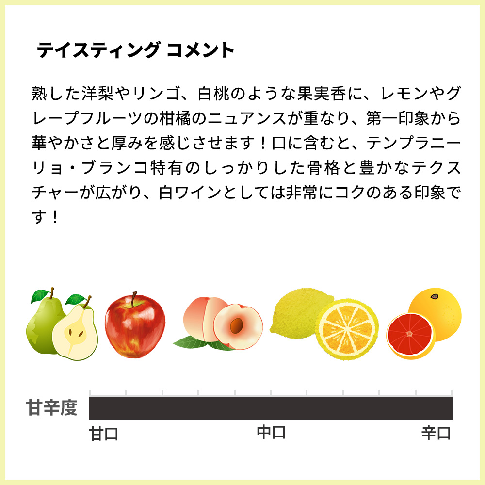 熟した洋梨やリンゴ、白桃のような果実香に、レモンやグレープフルーツの柑橘のニュアンスが重なり、第一印象から華やかさと厚みを感じさせます!さらに、フレンチオーク樽での発酵・熟成によって、バニラやトースト、ローストナッツ、ほのかな蜂蜜やバターの香りが加わり、香りの層に奥行きが生まれています!口に含むと、テンプラニーリョ・ブランコ特有のしっかりした骨格と豊かなテクスチャーが広がり、白ワインとしては非常にコクのある印象です!クリーミーで丸みのある口当たりの中に、芯の通った酸が存在し、重たくなりすぎず全体を引き締めています!シュール・リー由来の旨味が感じられ、味わいに一体感と深みを与えています!中盤から後半にかけては、熟した果実味と樽由来の香ばしさが調和し、ほのかなスパイスやミネラル感も顔を出します!余韻は長く、ナッツやトースト、わずかなビター感が心地よく残り、複雑で上質な印象を持続させます!全体として、リッチさとエレガンスを兼ね備えた、飲みごたえのある偉大な辛口白ワイン!