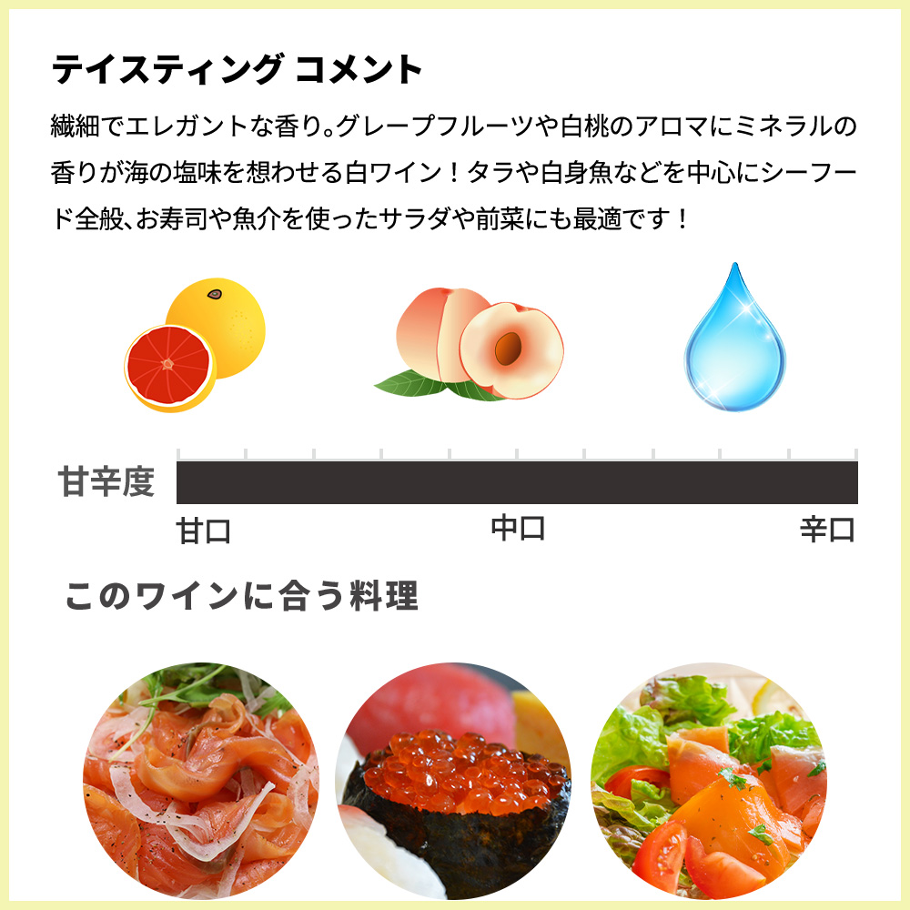 花のような芳醇な香りにフレッシュでバランスに優れたヴィオジーニョ種が主体で、シュールリー製法。繊細でエレガントな香り!グレープフルーツや白桃のアロマにミネラルの香りが海の塩味を想わせる白ワイン!タラや白身魚などを中心にシーフード全般、お寿司や魚介を使ったサラダや前菜にも最適です!