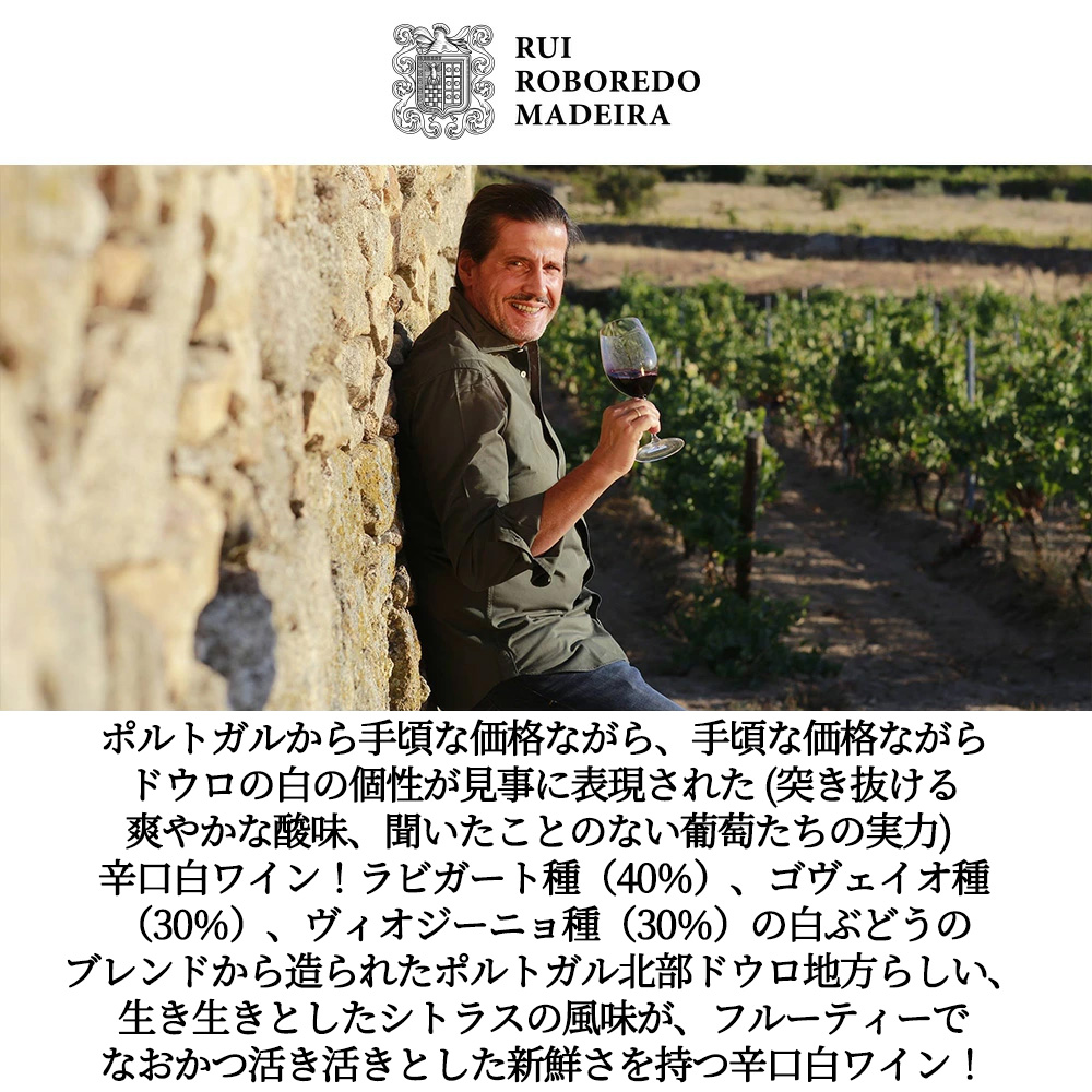 レヴィスタ・アデガ誌驚異の90点獲得!絶賛コメントは『ラビガート種(40%)、ゴヴェイオ種(30%)、ヴィオジーニョ種(30%)の白ぶどうのブレンドから造られた白ワインで、ドウロ・スーペリオールの片岩質土壌で栽培されたぶどうを使用しています。樽熟成はせず、ステンレスタンクで澱と短期間接触させることで熟成させています。香りと味わいは豊かで、白い果実や成熟した核果の風味が感じられ、その後に花やハーブのニュアンスが続きます。爽やかな酸味とクリーミーでしっかりとした食感が支えとなっています。ボディはしっかりとしており、塩味、柑橘、洋梨、オレンジの花のタッチを伴った豊かで持続する余韻があります。アルコール度数は13.5%です。90点』と絶賛!
