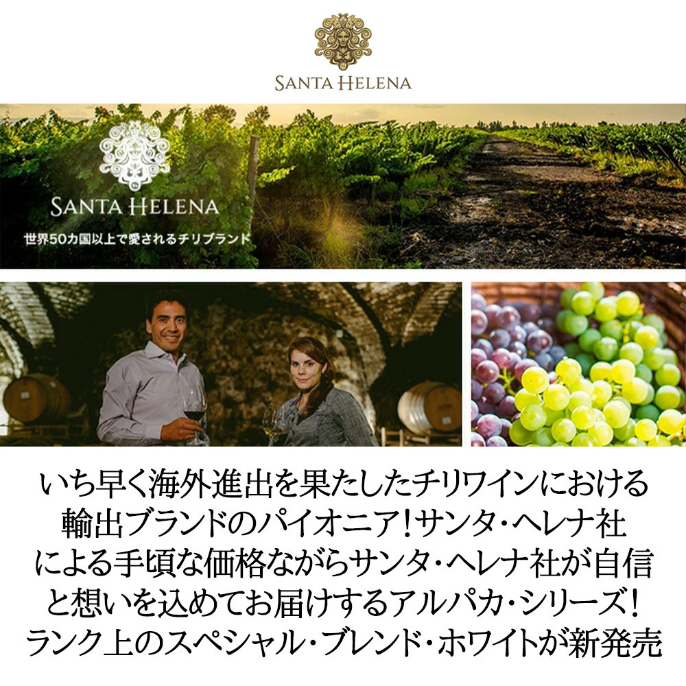 1942年創業のサンタ・ヘレナ社は、いち早く海外進出を果たしたチリワインにおける輸出ブランドのパイオニア!今は世界52ヵ国以上で愛飲されており、長年培ったワイン造りのノウハウをいかしつつ、より高い品質を目指し活動を開始したサンタ・ヘレナ社のワインは、今後ますます世界のワイン愛好家の注目を集めていくこと間違いなし!