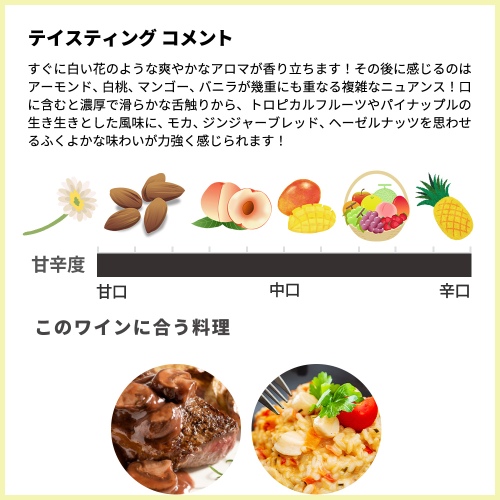 グラスに注ぐと、明るく輝きのある黄金色の色調!すぐに白い花のような爽やかなアロマが香り立ちます!その後に感じるのはアーモンド、白桃、マンゴー、バニラが幾重にも重なる複雑なニュアンス!口に含むと濃厚で滑らかな舌触りから、トロピカルフルーツやパイナップルの生き生きとした風味に、モカ、ジンジャーブレッド、ヘーゼルナッツを思わせるふくよかな味わいが力強く感じられます!余韻は長く、バランスのとれたリッチかつ上品な仕上がり!旨味のある濃厚な味わいは、クリームソースをかけた鶏肉料理やリゾットなどのクリーミーなお料理との相性抜群!