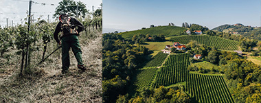 発酵は基本的にステンレスタンクを使い、一部のキュヴェ(“Sudsteiermark”を冠する3種類の定番キュヴェ)以外は天然酵母での発酵で、人工酵母は一切使いません。亜硫酸添加も発酵中か瓶詰め前のどちらかのタイミングでほんのわずかのみです。ステファンとベルンハルトにとってワイン造りにおいて最も大切にしている事はやはり畑に真摯に向き合うこと、それはつまりこの歴史ある大地を健康なまま守り続けることに繋がっているといいます。ワイナリーの運営も大事ですが、それ以上に“サスティナビリティ”を人生の基本に置いており除草剤、殺虫剤、化学肥料は畑に対して一切使わず、このテロワールを元の姿のまま未来の世代に受け継いでいくことが人生での大きな使命と考えています。
