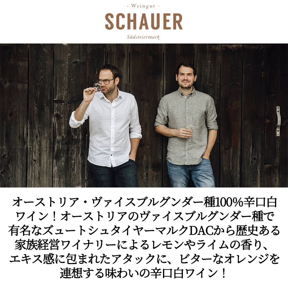 造り手は1757年からこの地でワイン造りを続けているシャウアー家 (なんと耕してきた全ての単一畑が1763年のハプスブルグ家の土地調査で作られた地図に記載されており、長く名誉ある歴史は信頼できる資料でも証明されております。) 現在はステファンとベルンハルトの二人の兄弟がワイナリーの中心人物。情熱ある二人は畑でもセラーでもいつも共に仕事をしております!伝統と革新の生産者で畑は主に弟のベルンハルトが担当、兄は醸造をメインで担当しています!収穫等の季節労働者を除いてその他には父と一人の従業員が働くのみの家族経営ワイナリーです!