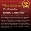 ワインアドヴォケイト誌驚異の98点でコメントは『2018年ヤッターナ・シャルドネは、マジパンとリンゴの皮、白胡椒、かすかに香る柑橘類、砕けた貝殻、サフラン、砂糖がけアーモンドの香りが先導する。口に含むと、このワインは信じられないほど絹のように滑らかで落ち着きがあり、梳かれた羊毛のようで、余韻は果てしなく続く。熟成期間はわずか3秒ほどに感じられる――時を超え、年齢を感じさせず、抑制が効いていて長い。素晴らしい。この熟成期以降にこれらのワインを飲めるなら、それは最高の喜びとなるでしょう。これは一流のシャルドネです。』!
