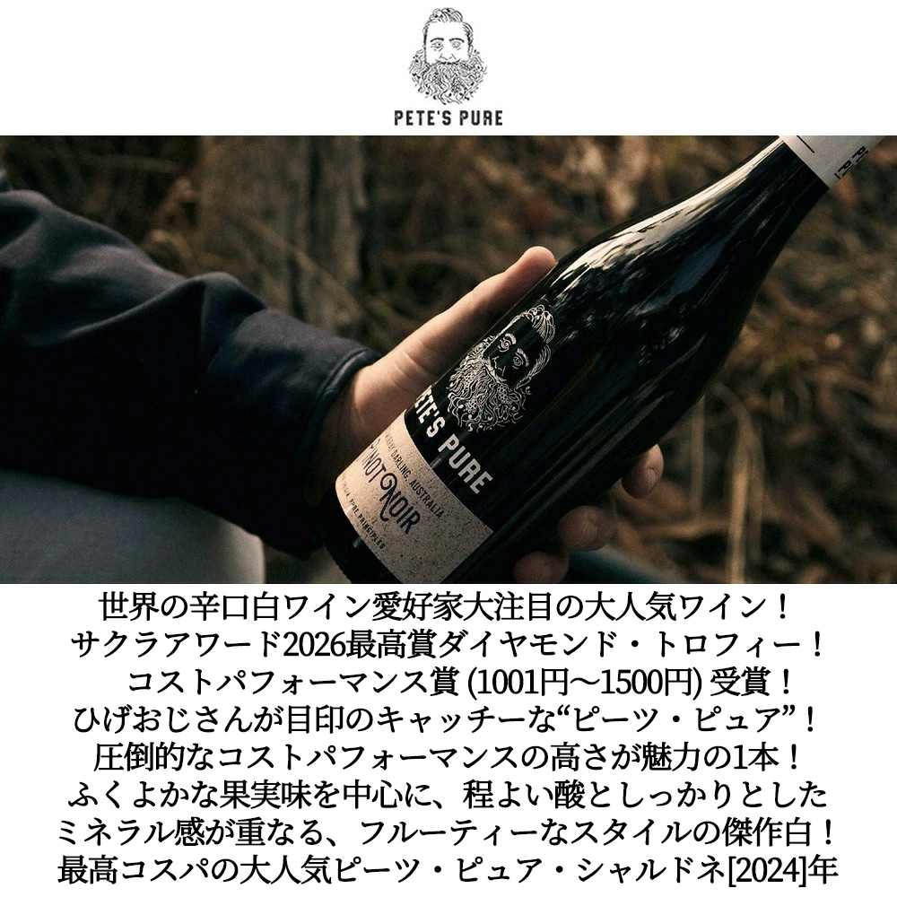 ピーツ・ピュア・シャルドネ[2024]年・ピーツ・ピュア・オーストラリア・ニュー・サウス・ウェールズ・GI.マレー・ダーリング・白・辛口・750ml・サクラワインアワード2026にて最高賞ダイヤモンド・トロフィー&ダブルゴールド、コストパフォーマンス賞(1001円~1500円)受賞