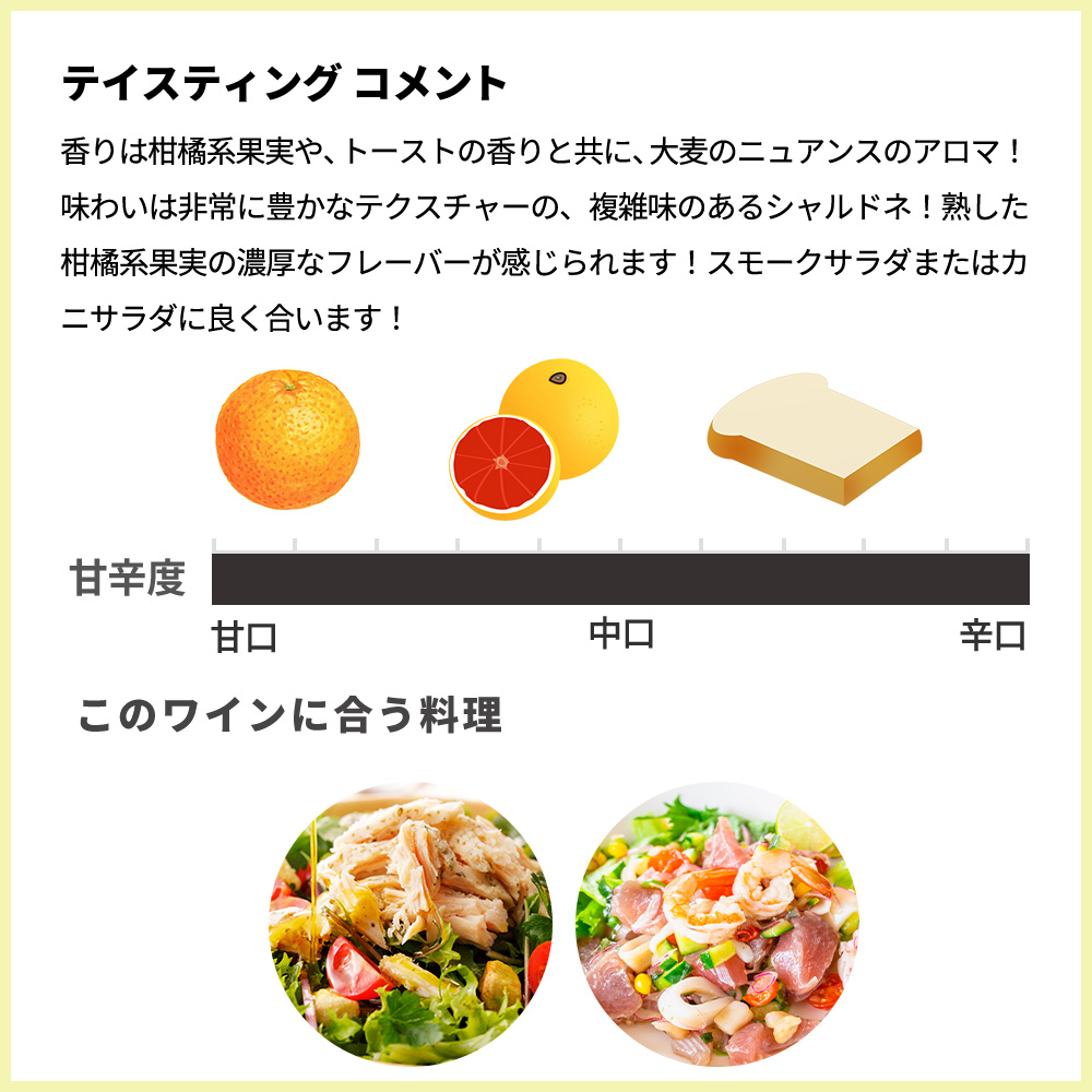 色合いはグリーンがかった麦わら色!香りは柑橘系果実や、トーストの香りと共に、大麦のニュアンスのアロマ!味わいは非常に豊かなテクスチャーの、複雑味のあるシャルドネ!熟した柑橘系果実の濃厚なフレーバーが感じられます!スモークサラダまたはカニサラダに良く合います!