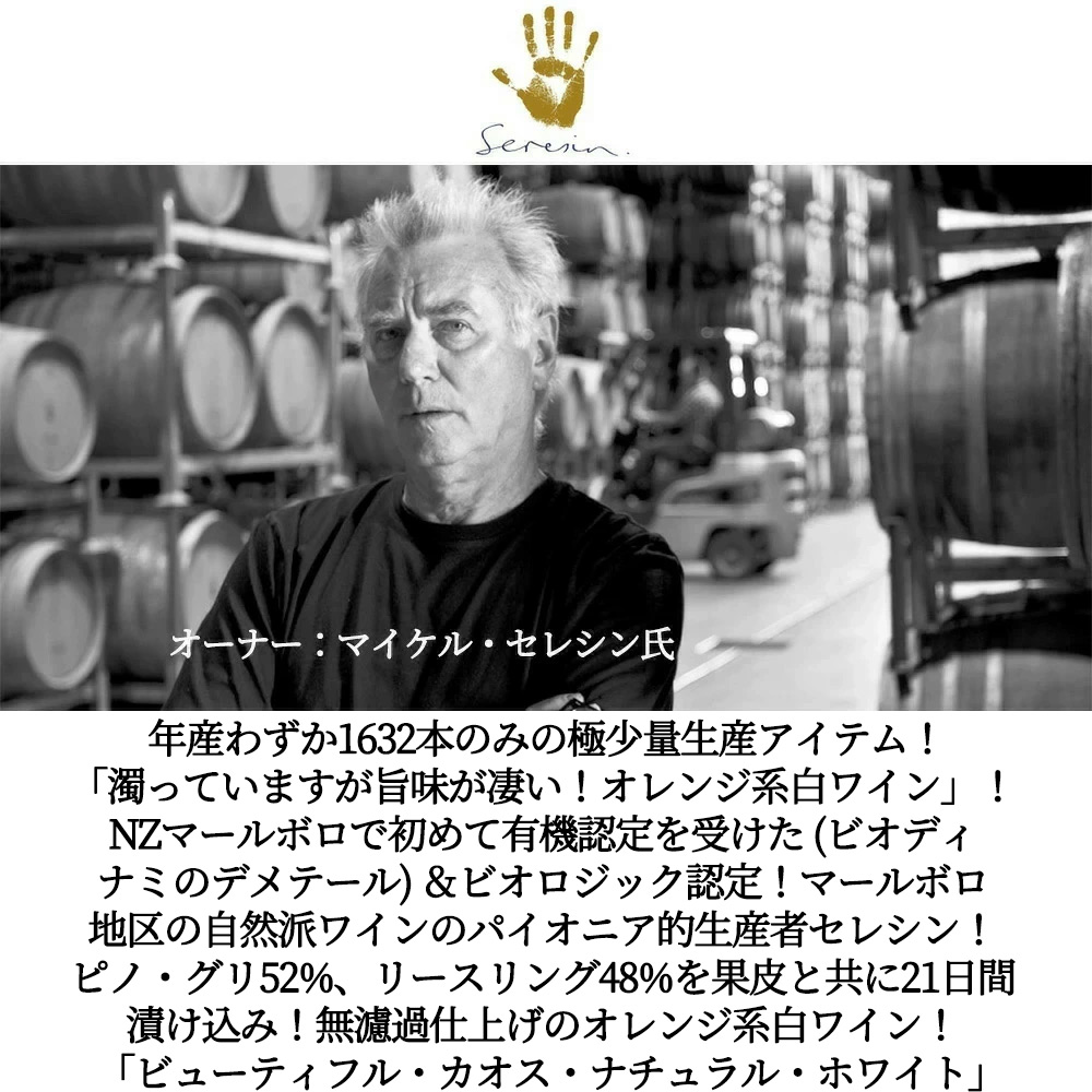 セレシン・エステイトについてインポーターさんは「セレシン・エステイトは世界で最高峰のソーヴィニヨン・ブランの産地として名高いマールボロ地区に位置します。ワイナリー設立当初はこの一帯は家畜農家が点在するだけで、ブドウ栽培とは無縁の放牧地帯でした。しかし、この地はニュージーランドでも最も日照量が多く、長く伸びる山脈によって守られ、大自然の恩恵をいかんなく受けることのできる、ワイン造りにとって最高の環境だったのです。これまで多くの高い評価を受けてきたセレシン・エステイト。2009年にはジャンシス・ロビンソン氏がニュージーランドTOP4 生産者の一つに数え上げました。正真正銘ニュージーランド最高の造り手としてその地位を気付いてきましたが、世界的に高い評価を受けるようになった現在でも、他人の評価に翻弄されることなく、「テロワールを素直に表現した真っ直ぐなワイン」を目指す彼らの姿勢に変わりありません。ワイナリーでは、創立当初から一貫して「ハンドクラフト=手作り」にこだわり、植物を「本来あるべき健康な土壌環境」におくことが非常に重要であるという考えのもと、大地が地球のリズムと地球環境に作用し合い、生物の滞在的な力を引き出すことのできる「ビオディナミ農法」を実践してきました。ラベルの手形はオーナーの手で、ハンドクラフトに対する蔵の姿勢を表現しています。」!