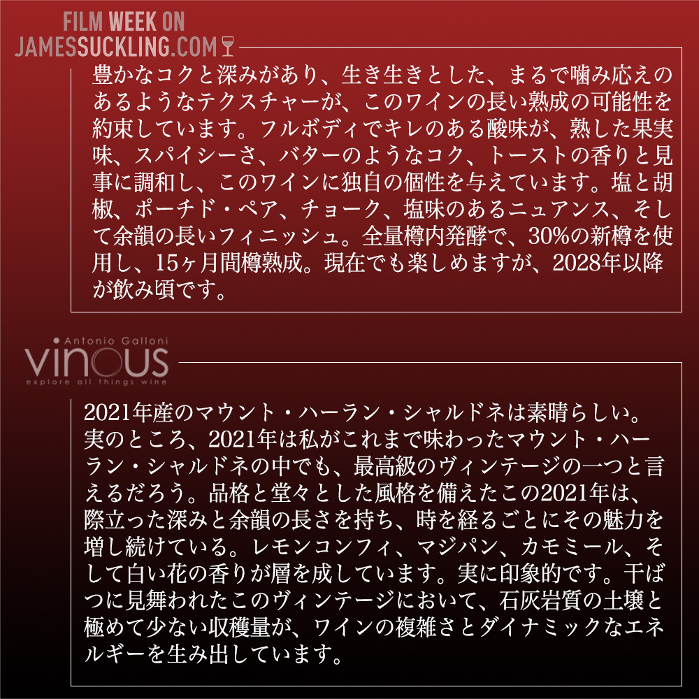 ヴィノス94点でコメントは「2021年産のマウント・ハーラン・シャルドネは素晴らしい。実のところ、2021年は私がこれまで味わったマウント・ハーラン・シャルドネの中でも、最高級のヴィンテージの一つと言えるだろう。品格と堂々とした風格を備えたこの2021年は、際立った深みと余韻の長さを持ち、時を経るごとにその魅力を増し続けている。レモンコンフィ、マジパン、カモミール、そして白い花の香りが層を成しています。実に印象的です。干ばつに見舞われたこのヴィンテージにおいて、石灰岩質の土壌と極めて少ない収穫量が、ワインの複雑さとダイナミックなエネルギーを生み出しています。」!