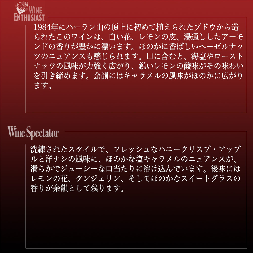 ワインエンスージアスト誌93点でコメントは「1984年にハーラン山の頂上に初めて植えられたブドウから造られたこのワインは、白い花、レモンの皮、湯通ししたアーモンドの香りが豊かに漂います。ほのかに香ばしいヘーゼルナッツのニュアンスも感じられます。口に含むと、海塩やローストナッツの風味が力強く広がり、鋭いレモンの酸味がその味わいを引き締めます。余韻にはキャラメルの風味がほのかに広がります。」!