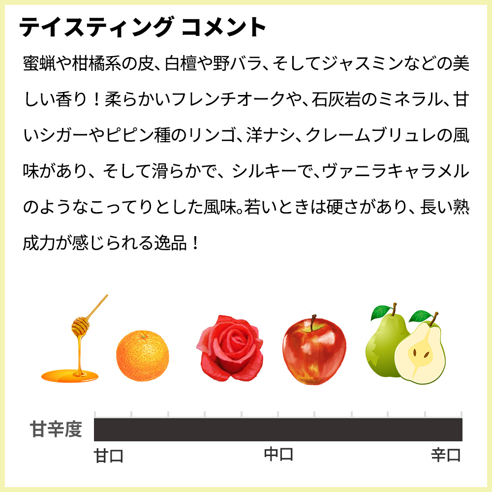 ワインスペクテーター誌90点でコメントは「洗練されたスタイルで、フレッシュなハニークリスプ・アップルと洋ナシの風味に、ほのかな塩キャラメルのニュアンスが、滑らかでジューシーな口当たりに溶け込んでいます。後味にはレモンの花、タンジェリン、そしてほのかなスイートグラスの香りが余韻として残ります。」!