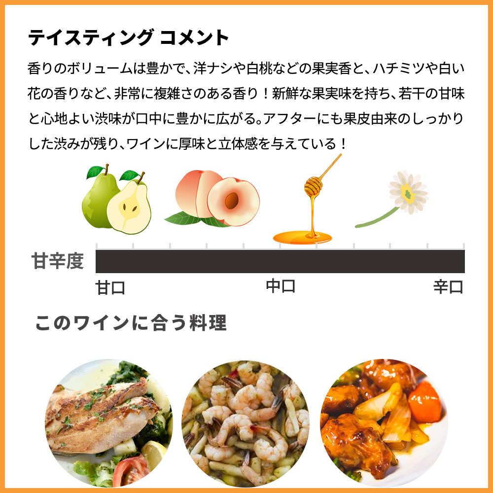 色→外観は透明度が高く、オレンジがかった濃いイエロー!香り→香りのボリュームは豊かで、洋ナシや白桃などの果実香と、ハチミツや白い花の香りなど、非常に複雑さのある香り!味わい→新鮮な果実味を持ち、若干の甘味と心地よい渋味が口中に豊かに広がる。アフターにも果皮由来のしっかりした渋みが残り、ワインに厚味と立体感を与えている!