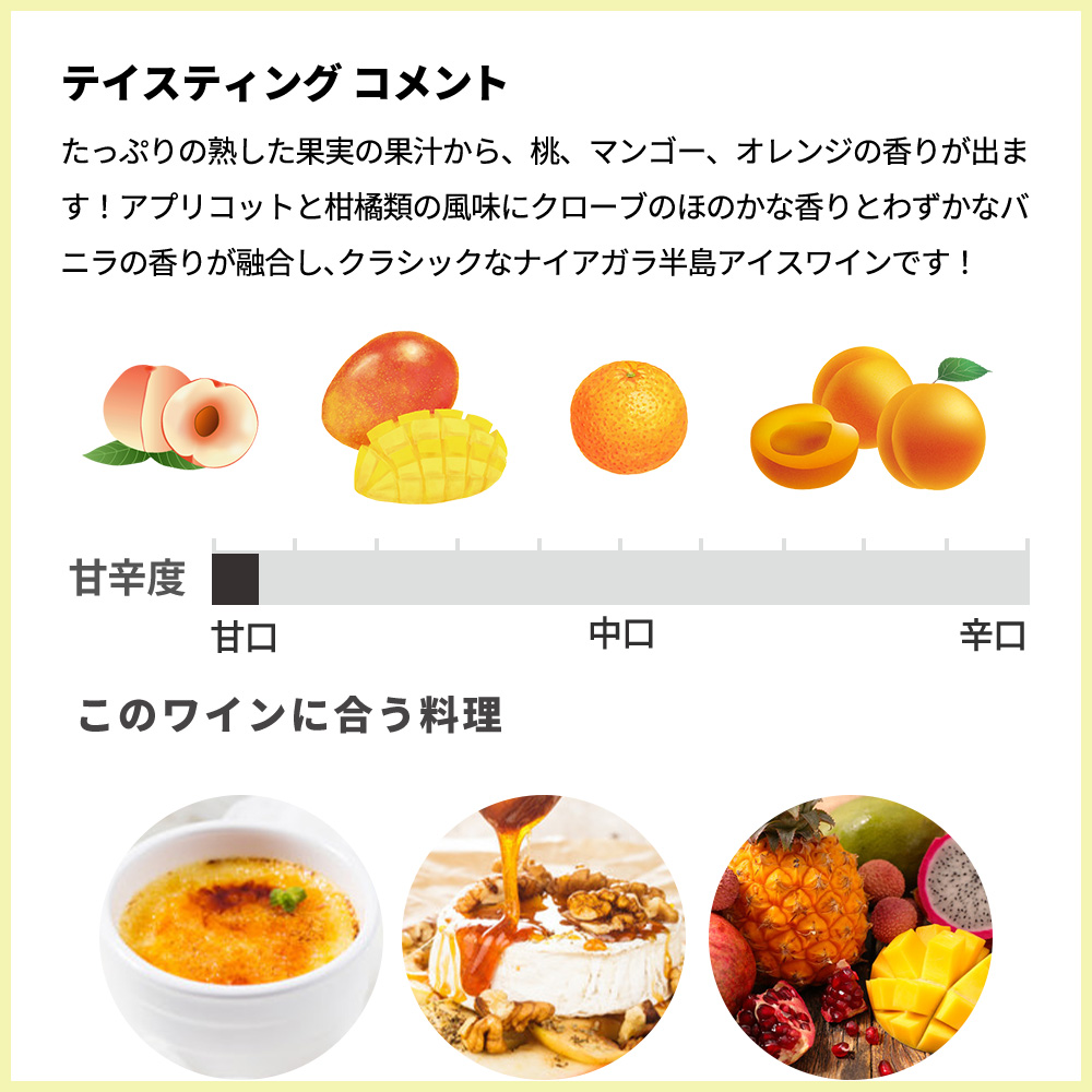 たっぷりの熟した果実の果汁から、桃、マンゴー、オレンジの香りが出ます!アプリコットと柑橘類の風味にクローブのほのかな香りとわずかなバニラの香りが融合し、クラシックなナイアガラ半島アイスワインです!伝統的なクレームブリュレとクレームキャラメルとはいつも相性が良いです!またトロピカルフルーツでも試してみてください!コンポート、ローストした桃やパイナップルとパナコッタ;蜂蜜を少しかけたチーズ、 (新鮮なシェーブルからパルメザンチーズまで) ベビールッガラとヘーゼルナッツを添えたブラウンバター、ロブスターサラダ;ヴィダルオニオンスープにチーズクルトン (クラシックなフレンチオニオンスープのスピンオフ) !