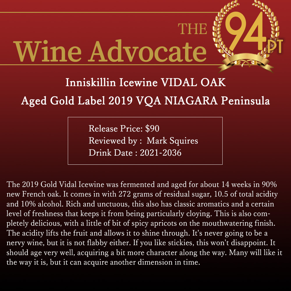 ワインアドヴォケイト誌驚異の94点獲得!絶賛コメントは『2019年のゴールド・ヴィダル・アイスワインは、およそ14週間、90%が新しいフレンチオークで発酵・熟成されました。残糖は272グラム、総酸度は10.5、アルコール度数は9.5%です。豊かで濃厚でありながら、クラシックなアロマと、甘ったるくなりすぎない程度のフレッシュ感も備えています。口に含むと少しスパイシーなアプリコットの風味が楽しめ、完全に美味しいワインです。酸味が果実を引き立て、その味わいを際立たせます。決して神経質なワインではありませんが、だらけているわけでもありません。甘口ワインが好きな人には失望させません。熟成も非常に良く、時間とともにさらに個性を増していくでしょう。多くの人は現状のまま楽しめますが、時間が経つことで別の次元の魅力を獲得することもあります。飲み頃 2021-2036年 94点』とこれまた大絶賛!