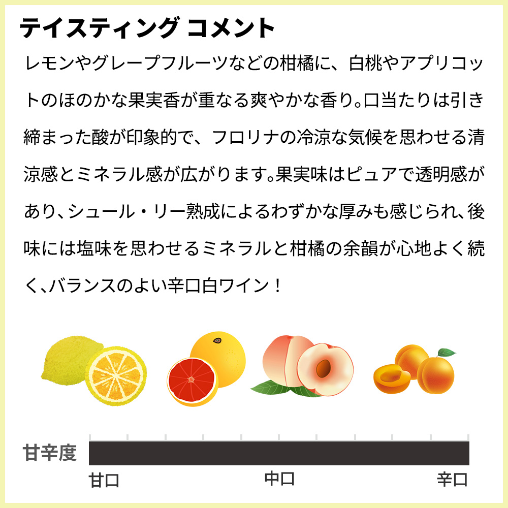 「レモンやグレープフルーツなどの柑橘に、白桃やアプリコットのほのかな果実香が重なる爽やかな香り。口当たりは引き締まった酸が印象的で、フロリナの冷涼な気候を思わせる清涼感とミネラル感が広がります。果実味はピュアで透明感があり、シュール・リー熟成によるわずかな厚みも感じられ、後味には塩味を思わせるミネラルと柑橘の余韻が心地よく続く、バランスのよい辛口白ワイン」!