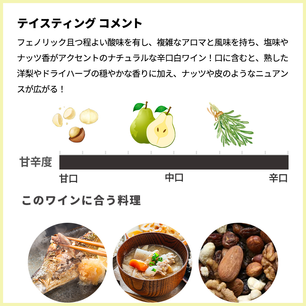 フェノリック且つ程よい酸味を有し、複雑なアロマと風味を持ち、塩味やナッツ香がアクセントのナチュラルな辛口白ワイン!一般的な白ワインよりも旨味と質感に重心がある味わい!口に含むと、熟した洋梨やドライハーブの穏やかな香りに加え、ナッツや皮のようなニュアンスが広がる!果皮浸漬由来のほのかな渋み(フェノリック)があり、軽いオレンジワイン的なタッチも感じられる!酸は控えめで、その代わりに塩味を伴うミネラル感と出汁のような旨味が余韻まで続く!無濾過らしいにごり由来の複雑さもあり、素朴で奥行きのある、やや個性的な辛口白ワイン!魚の塩焼きや和食 (特に出汁系) 、ナッツ系料理との相性抜群!