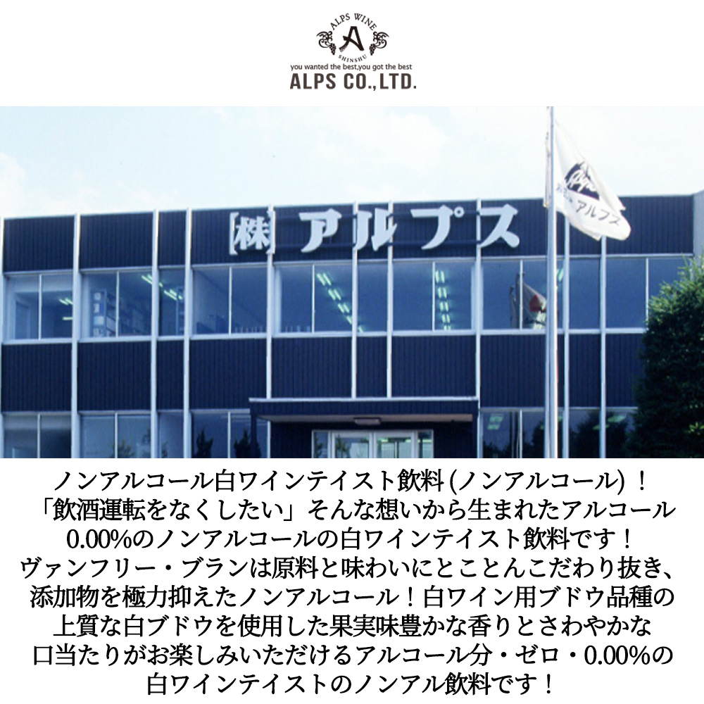 【アルプス】ヴァンフリー・白・720ml・ノンアルコール・ホワイトワインテイスト(白)・アルプスワイン・アルコール分・ゼロ・0.00%の白ワインテイストのノンアル飲料(果実由来の渋みと酸味が自然な味わいとなり、食事にもよく合います。)・酸化防止剤無添加