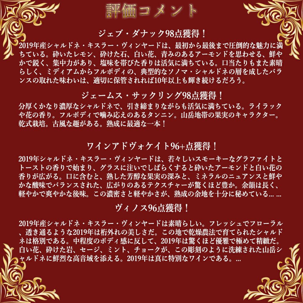 他の画像を見る 【大型ボトル】キスラー ヴィンヤーズ ソノマ ヴァレー シャルドネ 2019 キスラー ヴィンヤード ソノマ マウンテン 重厚ボトル 正規品Kistler Sonoma Valley Chardonnay 2019 Sonoma Mountain 白ワイン アメリカ 辛口 当店特別価格 ¥ 62,491 税込 在庫切れ 詳細を見る お気に入りに登録する