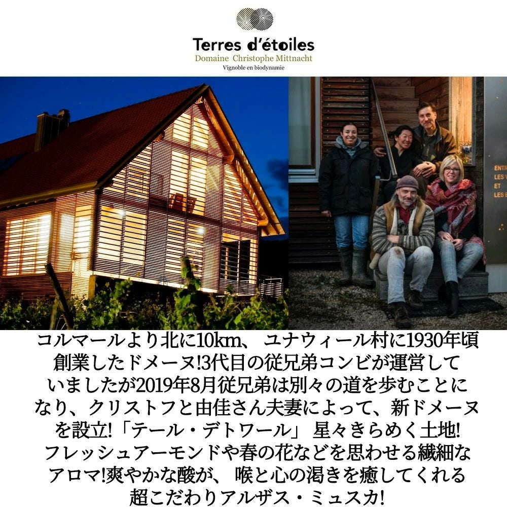 他の画像を見る アルザス ミュスカ 2023年 蔵出し限定品 テール デトワール(クリストフ ミットナット)元詰 AOCアルザス ミュスカAlsace Muscat 2023 Terres d'etoiles(Christophe Mittnacht) AOC Alsace Muscat【eu_ff】 白ワイン フランス やや辛口 当店特別価格 ¥ 3,594 税込 在庫切れ 詳細を見る お気に入りに登録する