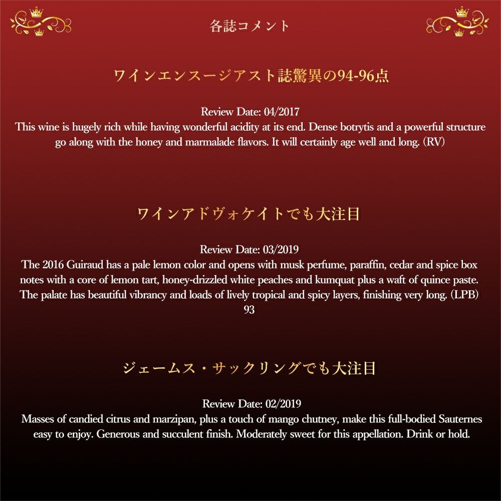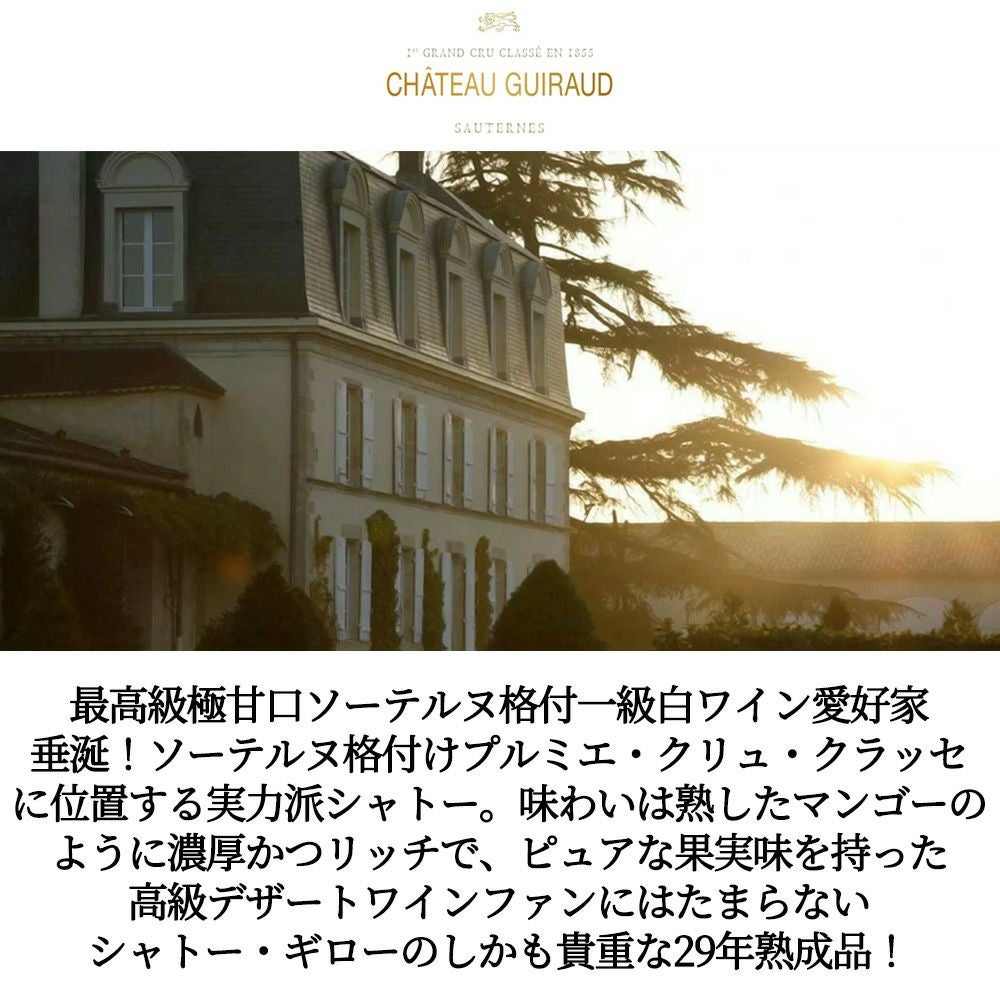 他の画像を見る シャトー ギロー 1996 AOCソーテルヌ プルミエ クリュ クラッセ 格付第1級 シャトー元詰 ワインエンスージアスト誌驚異の94-96点Chateau Guiraud 1996 AOC Sauternes 1er Cru Classe 白ワイン フランス 極甘口 当店特別価格 ¥ 13,242 税込 在庫切れ 詳細を見る お気に入りに登録する