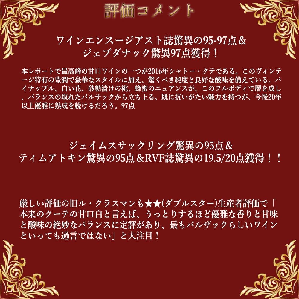 他の画像を見る シャトー クーテ 2016 秘蔵限定希少品 ソーテルヌ (プルミエ グラン クリュ クラッセ) (格付第一級) AOCソーテルヌ バルザックChateau Coutet 2016 Sauternes 1er Grand Cru 白ワイン フランス 極甘口 当店特別価格 ¥ 7,597 税込 在庫切れ 詳細を見る お気に入りに登録する
