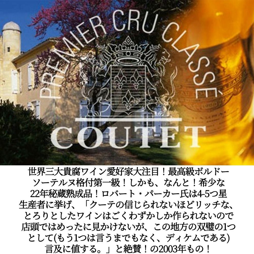 他の画像を見る 【ハーフサイズ】シャトー クーテ 2003 秘蔵限定作品 AOCソーテルヌ (プルミエ グラン クリュ クラッセ) 白 極甘口 14% 22年熟成品Chateau Coutet 2003 Sauternes 1er Grand Cru 白ワイン フランス 極甘口 当店特別価格 ¥ 4,111 税込 在庫切れ 詳細を見る お気に入りに登録する