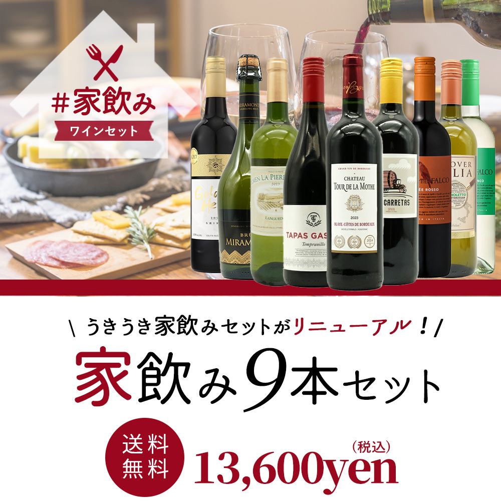 うきうきワインの玉手箱厳選!「ご自宅で本格派ワインを気軽にお楽しみいただきたい」!毎日の食卓でもっと気軽にワインを飲んで頂きたいという思いを込めて誕生したワインセット!中身は一切の妥協なし!こだわりの9本をスタッフ一同でセレクト!高級ボルドー金賞受賞酒、イタリア、南フランス、スペイン等のオススメ赤ワインが計5本!地中海生まれのすっきり辛口白ワインをはじめ極上辛口白ワインの計3本!モンテベッロ・スプマンテが1本のうきうきワインセット9本家飲みセット!さらにお魚料理やお肉料理、お鍋料理等オールマイティーにマリアージュ可能!赤・白・泡の当店通常販売価格合計9本びっくりプライス!家飲みワインセットを特別価格でご案内!しかも送料無料でお届け!