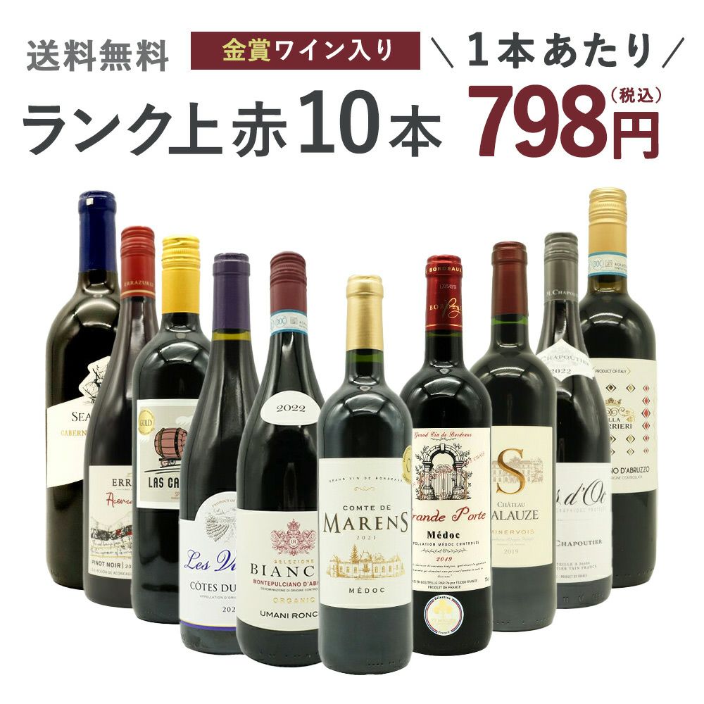 ワインのプロが超厳選!辛口赤ワイン愛好家に朗報!「ワインは難しい」「何を選んでよいか分からない」という方にも超お薦め! 「ご自宅で本格派赤ワインを気軽にお楽しみいただきたい」! 「毎日の食卓でもっと気軽にワインを飲んで頂きたい」! 「もちろん飲食店様のグラス用、ボトル用にもお使いいただきたい」! という思いを込めて、玉手箱スタッフが厳選!ランク上の赤ワインが大集結!しかも世界著名5か国のワイン入り!しかも品種も多種多様! さらに前菜からメインまでオールマイティーなコスパ抜群の南仏フルボディ辛口赤ワインが1本!高級ミネルヴォワの究極シャトー・サルーズが1本! さらにローヌ地方を代表する銘醸生産者であり、世界のトップクラスのワイン生産者として知られるM.シャプティ社の最高コスパ南仏赤ワイン! 高級グラン・レゼルバ規格の高級スパニッシュや樽熟成100%のチリ・ピノ、高級カリフォルニア・カベルネまで入ったランク上の赤ワインが大集結! この内容で1本あたり驚異の798円(税込)で味わえる!びっくり価格7,980円(税込)!しかも送料無料でお届け! 超こだわり極旨赤ワイン飲み比べ最高コスパ10本ワインセットでワインライフをお楽しみください!