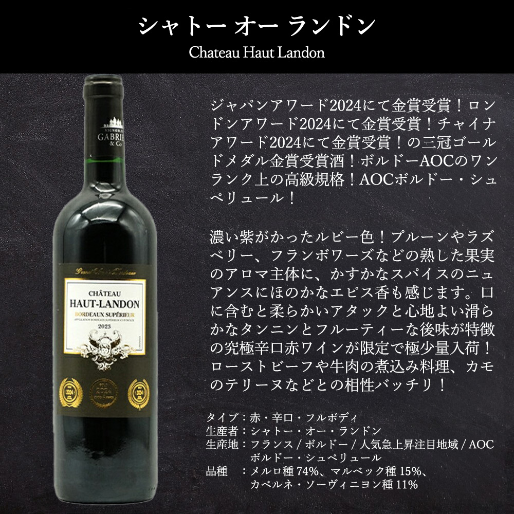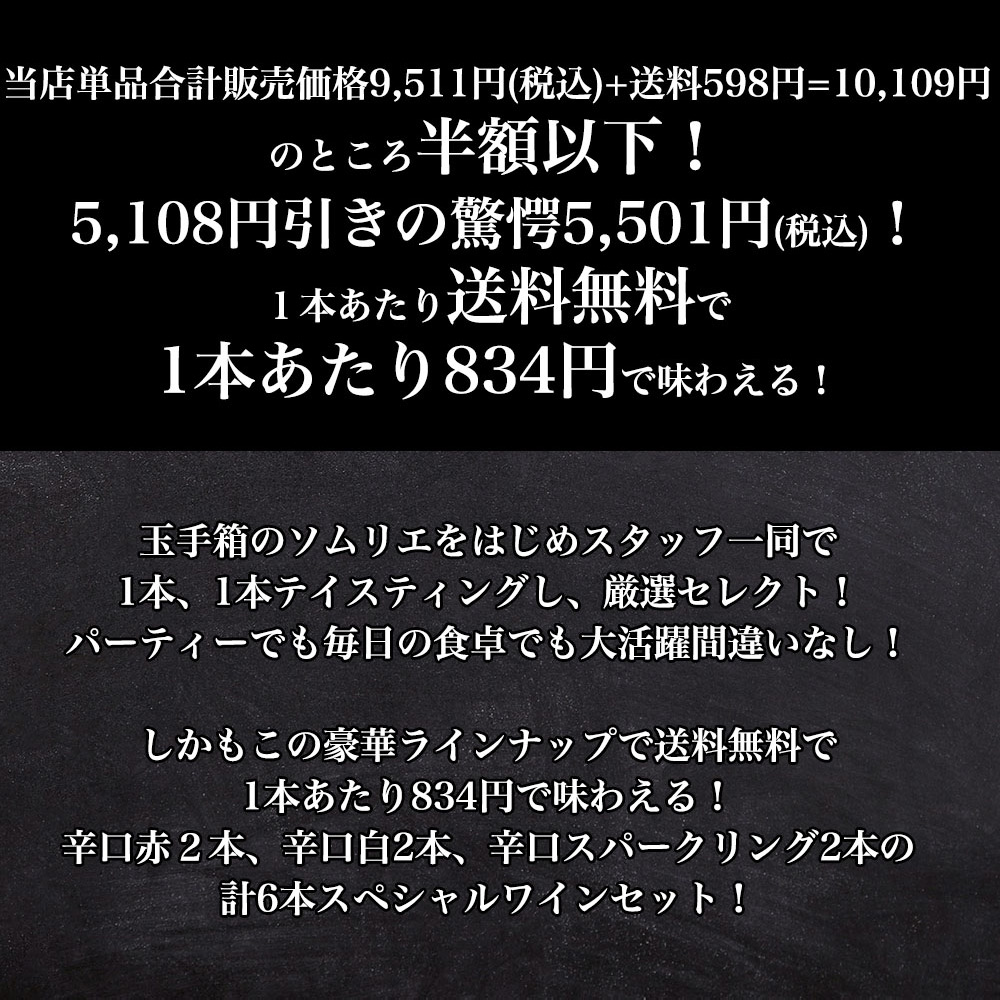 うきうきワインの玉手箱スペシャルセレクション赤・白・泡6本飲み比べワインセットが遂に誕生! 玉手箱のソムリエをはじめスタッフ一同で1本、1本テイスティングし、厳選セレクト!パーティーでも毎日の食卓でも大活躍間違いなし!しかもこの豪華ラインナップで送料無料で1本あたり834円で味わえる!辛口赤2本、辛口白2本、辛口スパークリング2本の計6本スペシャルワインセット! ボルドーAOCのワンランク上の高級規格!AOCボルドー・シュペリュールのフルボディ辛口赤ワインの三冠ゴールドメダル金賞受賞酒が1本! 一度絶滅したとされていましたが、ロンガネージ家という農家の畑に一本だけ古樹が残っており、そこから復活!「奇跡のブドウ」とも呼ばれる、イタリアでも非常に希少なブドウ品種で固有品種ロンガネージ種100%で造られる極旨フルボディ辛口赤ワインが1本! “ラングドックのベェネツィア”と呼ばれるセット(Sete)の近くで古くから栽培される“ピクプール”という土着品種で造られる地中海生まれのコスパ抜群のすっきり辛口白ワインが1本! マルケ州のリーダー!大人気ウマニ・ロンキが自社畑100%!ヴェルディッキオ種100%で造る、ワンランク上のクラッシコ規格!フレッシュでフルーティーで豊かな香り!辛口の味わいで、アーモンドを思わせる!ヴェルディッキオらしいアフターに感じるビターがたまらなく素晴らしい究極白ワインが1本! シャンパーニュと同じ土壌を持ち、ブドウ栽培に適した畑として知られる、地中海を望むスペイン・カタルーニャ地方ペネデスの地で造られる、シャンパーニュと同じ瓶内2次発酵方式で造られるスペイン(高級シャンパン方式で造られる)高級カバ!しかもカヴァの中でも最辛口に分類されるブリュット・ナチュール(補糖なし)が1本! 1930年代、ペルリーノファミリーの情熱と不屈の精神により、イタリアのスパークリング業界で大成功!独自のノウハウと専門性を進化させ、ブドウ畑から消費者まで、製造の各ステップにおける商品の品質を知り尽くした熟練者ペルリーノの究極スプマンテ!その名も「ソー・ハッピー」!ちょっと良いことがあった時、お祝い気分の時など、皆さんの毎日をハッピーに!日常に喜びをもたらす、フレッシュでフルーティなデイリー・スプマンテが1本の計6本! 当店単品合計販売価格9,511円(税込)+送料598円=10,109円のところ半額以下! 5,108円引きの驚愕5,501円(税込)!1本あたり送料無料で1本あたり834円で味わえる! パーティーでも毎日の食卓でも大活躍違いなしの豪華スペシャル赤・白・泡飲み比べセット!