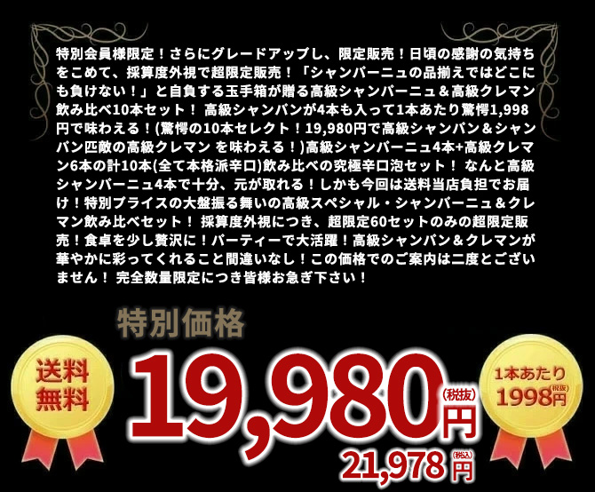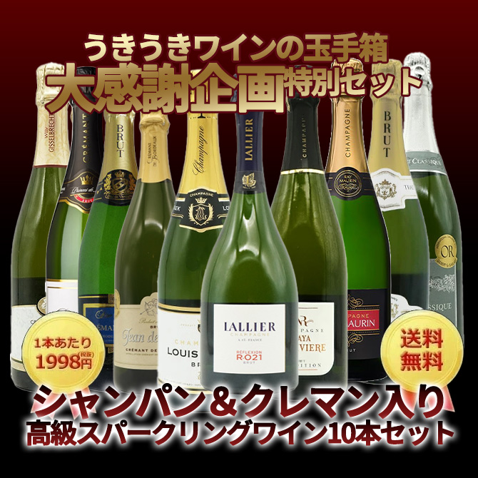 特別会員様限定!さらにグレードアップし、限定販売!日頃の感謝の気持ちをこめて、採算度外視で超限定販売!「シャンパーニュの品揃えではどこにも負けない!」と自負する玉手箱が贈る高級シャンパーニュ&高級クレマン飲み比べ10本セット! 高級シャンパンが4本も入って1本あたり驚愕1,998円で味わえる!(驚愕の10本セレクト!19,980円で高級シャンパン&シャンパン匹敵の高級クレマン を味わえる!)高級シャンパーニュ4本+高級クレマン6本の計10本(全て本格派辛口)飲み比べの究極辛口泡セット! なんと高級シャンパーニュ4本で十分、元が取れる!しかも今回は送料当店負担でお届け!特別プライスの大盤振る舞いの高級スペシャル・シャンパーニュ&クレマン飲み比べセット! 採算度外視につき、超限定60セットのみの超限定販売!食卓を少し贅沢に!パーティーで大活躍!高級シャンパン&クレマンが華やかに彩ってくれること間違いなし!この価格でのご案内は二度とございません! 完全数量限定につき皆様お急ぎ下さい!