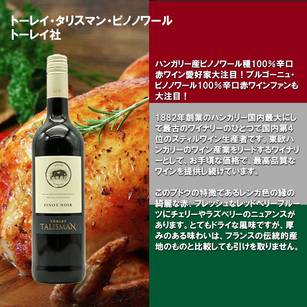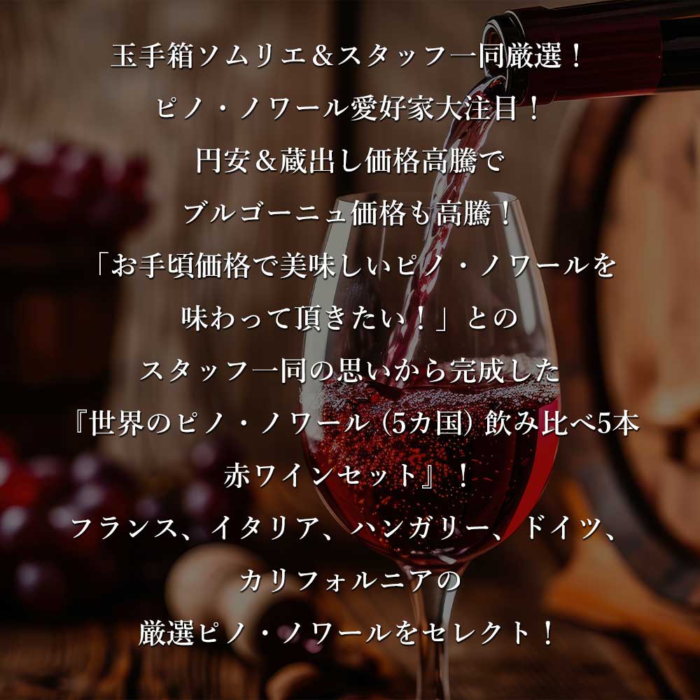 玉手箱ソムリエ&スタッフ一同厳選!ピノ・ノワール愛好家大注目!円安&蔵出し価格高騰でブルゴーニュ価格も高騰!「お手頃価格で美味しいピノ・ノワールを味わって頂きたい!」とのスタッフ一同の思いから完成した『世界のピノ・ノワール (5カ国) 飲み比べ5本赤ワインセット』!フランス、イタリア、ハンガリー、ドイツ、カリフォルニアの厳選ピノ・ノワールをセレクト! 中身は、1954年設立のワイナリーで、1780年創業のネゴシアン、パトリアッシュ社の傘下にあるワイナリー!クーヴァン・デ・ヴィジタンディーヌによる厳選ピノ・ノワール100%をステンレスタンク醗酵!80%ステンレスタンク熟成、20%オーク樽熟成(仏産、228L)で造られる本格派ブルゴーニュ・ピノ・ノワールが1本! 今やロマーニャ全域のワインを製造するイタリアを代表する会社となったCE.VICO社!ピノ・ネロ(ピノ・ノワール)100%手摘み100%で造られたイタリア産ピノ・ノワール!渋みが控えめでありながらも深みのある味わい!ブルゴーニュのタンニンがしっかりしたものや、ニューワールド系のアルコール度数が高めでフルボディのものとも異なる、親しみやすさを持った仕上がりの極旨辛口赤ワインが1本! 1882年創業のハンガリー国内最大にして最古のワイナリー“トーレイ社”によるハンガリー産ピノ・ノワール!樹齢驚異の30-35年のピノ・ノワール種100%を木樽5~6ケ月熟成で造られる、フレッシュなレッドベリーフルーツにチェリーやラズベリーのニュアンスのクラシックタイプのピノノワール100%辛口赤ワインが1本! ドイツ・ラインヘッセン地方からピノ・ノワール種100%で造られる、エレガントで円やかな味わいが楽しめるドイツ産ピノ・ノワールが1本! 土壌の豊かさを無垢に表現する造り手シーリッジワイナリー!赤系果実の甘酸っぱい香りやベリー類の甘い香りにスパイスのアクセント!全体的にフレッシュながらも、程よく熟れた果実の印象!口当たりは柔らかくフレッシュ!余韻に心地良い酸味とタンニンが続く、親しみやすい味わいのカリフォルニア・ピノが1本の計5カ国(5種)飲み比べ世界のピノ・ノワールセット! パーティーで毎日の食卓で世界のピノ・ノワールの魅力を感じてください!送料無料でお届けします!