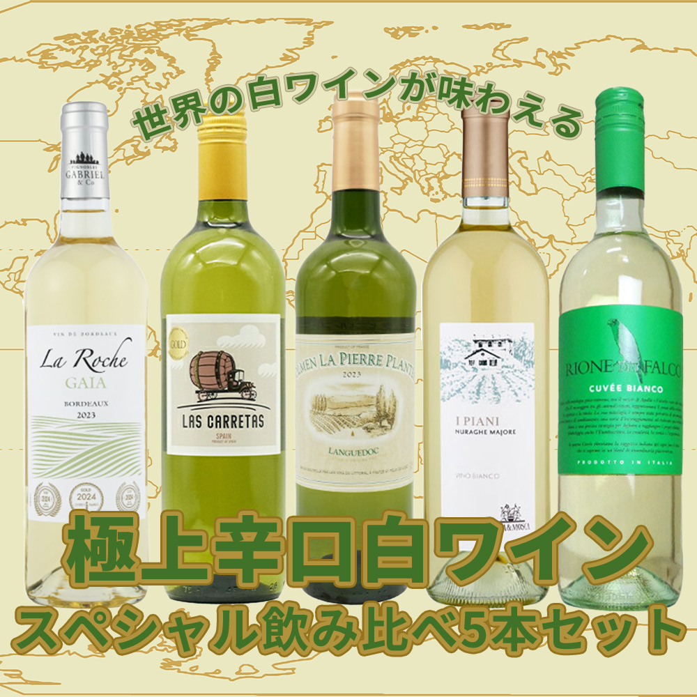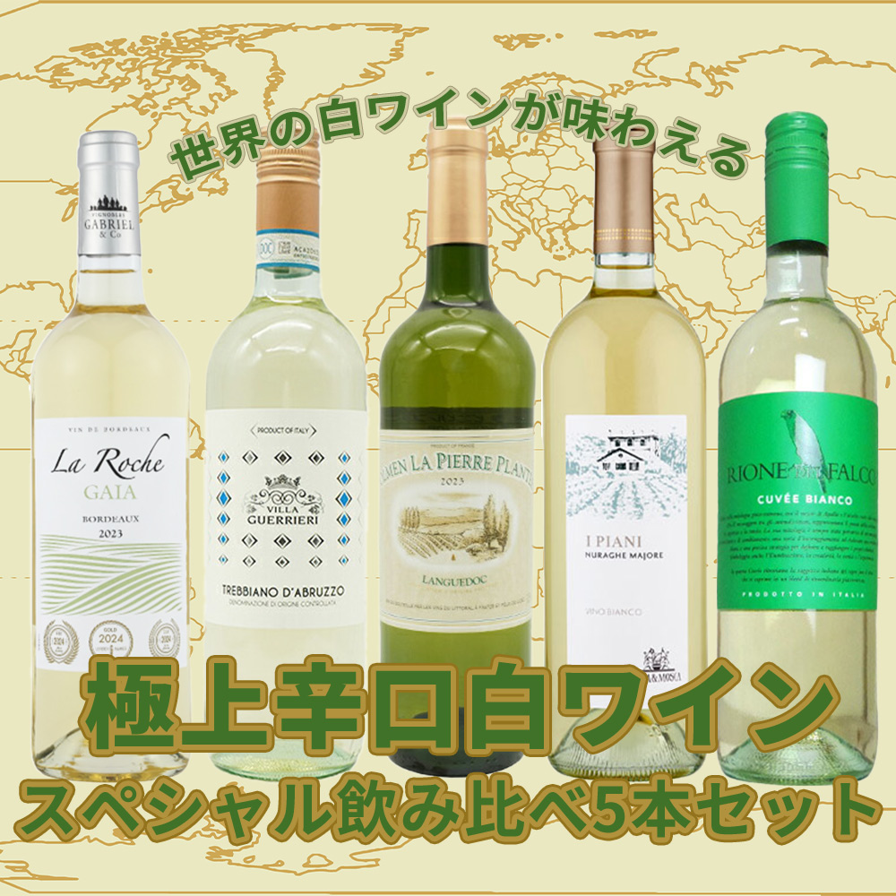 辛口白ワインファン大注目!当店玉手箱超厳選!ブルゴーニュ、スペイン、チリ、イタリア等、世界を代表するワイン産地から、当店ソムリエ、スタッフが厳選!えりすぐりの大人気スペシャル辛口白ワインばかりの究極辛口白ワイン5本セット!究極辛口白ワイン5本セットが1本当たり876円(税込)で味わえる!レストラン様にも超オススメ!ずばりスペシャル価格でご案内!しかも太っ腹!宅配料無料!当店超自信の究極辛口白ワインセットをこの機会に是非お試しください!