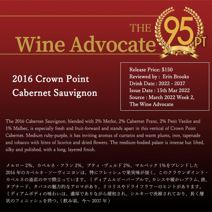 他の画像を見る クラウン ポイント ヴィンヤーズ カベルネ ソーヴィニヨン 2016 カリフォルニア サンタバーバラ カウンティ 醸造家シモン フォリーCrown Point Vineyards Cabernet Sauvignon 2016 赤ワイン アメリカ フルボディ 辛口 当店特別価格 ¥ 23,731 税込 カートに入れる お気に入りに登録する