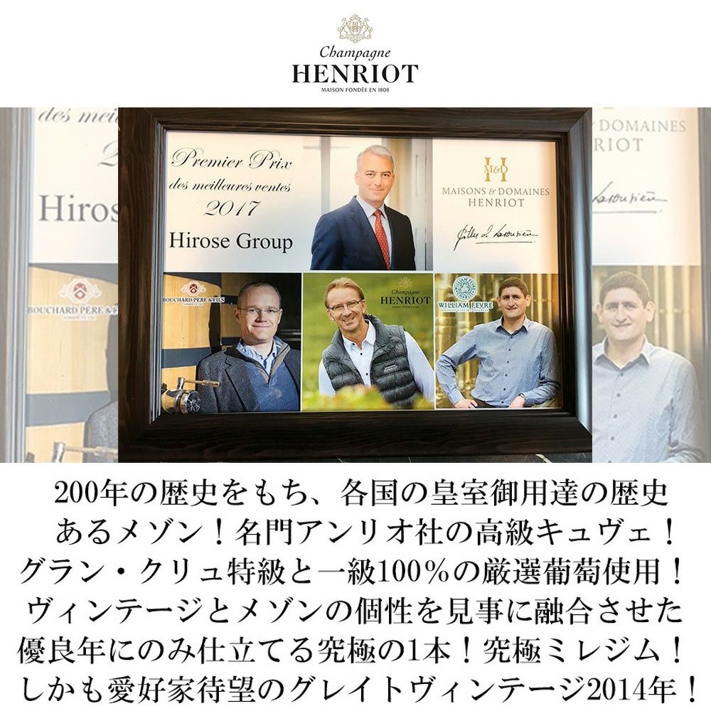 他の画像を見る 【箱入】アンリオ シャンパーニュ ブリュット ミレジメ 2014 アンリオ社 AOCミレジム シャンパーニュ ドサージュ5g/L 正規品Henriot Champagne Brut Vintage [2014] シャンパン フランス 辛口 当店特別価格 ¥ 13,522 税込 カートに入れる お気に入りに登録する