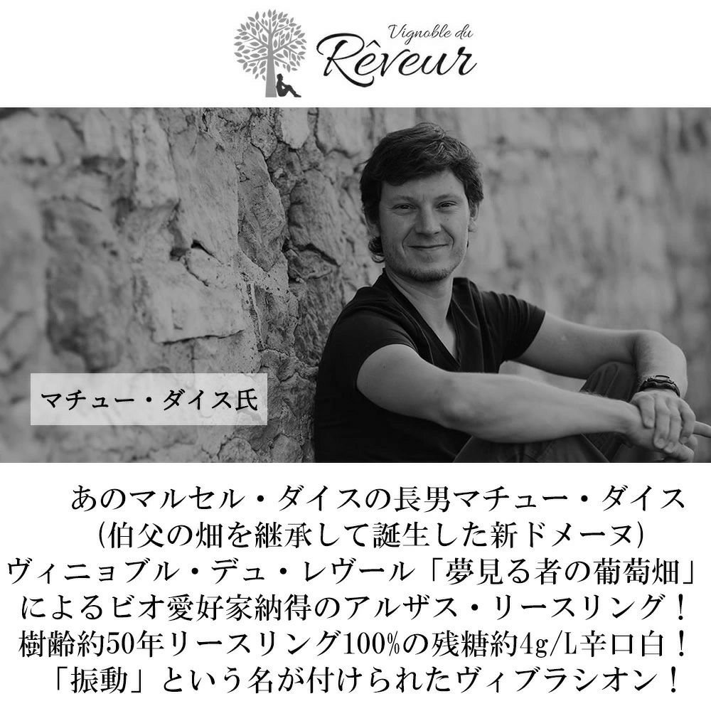 他の画像を見る ヴィブラシオン(アルザス リースリング) 2023 セック ヴィニョブル デュ レヴール元詰「ドメーヌ マルセル ダイス」の息子マチュー AOCアルザスVibrations 2023 Vignoble du Reveur BIO 白ワイン フランス 辛口 当店特別価格 ¥ 4,096 税込 カートに入れる お気に入りに登録する