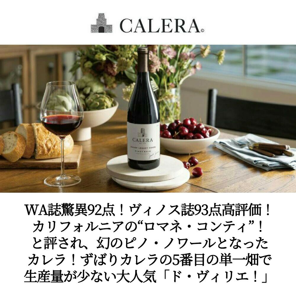 他の画像を見る カレラ ド ヴィリエ ヴィンヤード マウント ハーラン ピノ ノワール 2016 日本正規代理店輸入品CALERA de VILLIERS VINEYARD Mt. Harlan Pinot Noir 2016 赤ワイン アメリカ フルボディ 辛口 当店特別価格 ¥ 15,654 税込 カートに入れる お気に入りに登録する