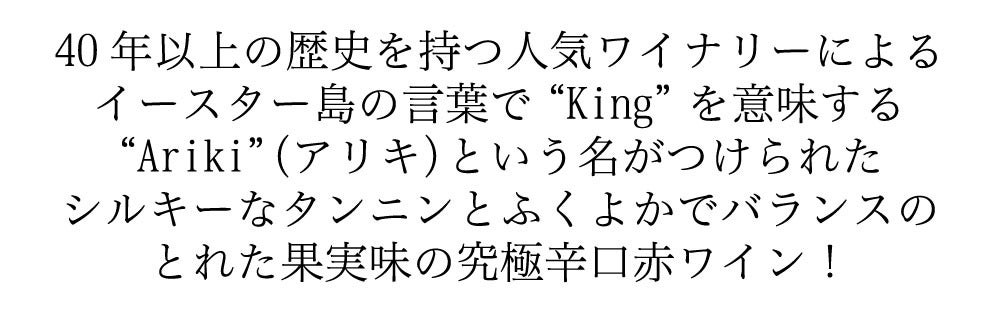 他の画像を見る アリキ カベルネ ソーヴィニヨン シングル ヴィンヤード 2025 ヴィーニャ ラルコ社(アクッラ家) クリコ ヴァレーAriki Cabertnet Sauvignon Single Vineyard 2025 Vina RALCO (Achurra Family) Curico Valley (Chile)【MO★1】 赤ワイン チリ フルボディ 辛口 当店特別価格 ¥ 657 税込 カートに入れる お気に入りに登録する