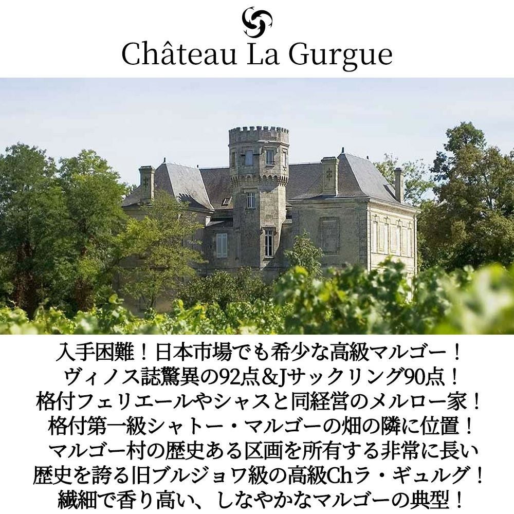 他の画像を見る シャトー ラ ギュルグ 2017 AOCマルゴー (メドック格付第三級シャトー フェリエールと同経営) シャトー元詰 飲み頃9年熟成作品Chateau La Gurgue 2017 AOC Margaux 赤ワイン フランス フルボディ 辛口 当店特別価格 ¥ 4,786 税込 在庫切れ 詳細を見る お気に入りに登録する