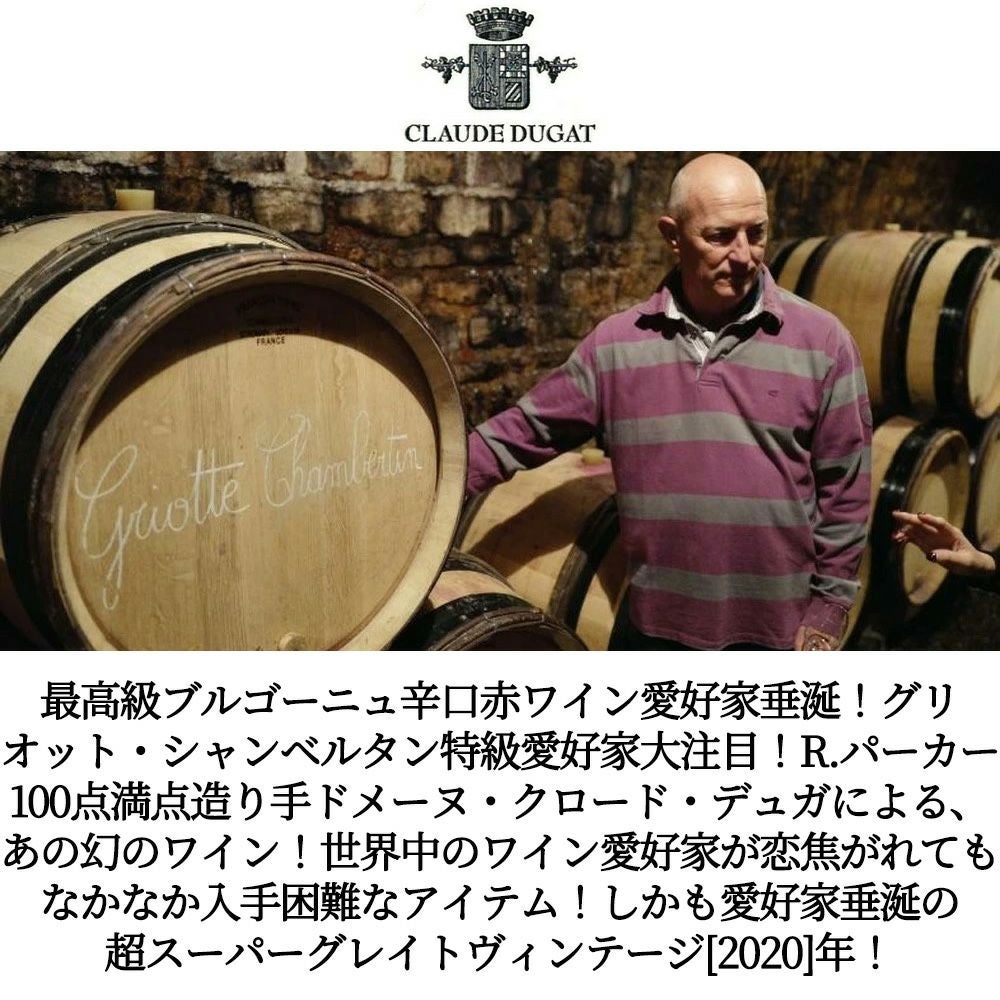 他の画像を見る グリオット シャンベルタン グラン クリュ 特級 2020 ドメーヌ クロード デュガ元詰 WA誌驚異の96-98点Griotte Chambertin Grand Cru 2020 Domaine Claude Dugat 赤ワイン フランス フルボディ 辛口 当店特別価格 ¥ 177,441 税込 在庫切れ 詳細を見る お気に入りに登録する