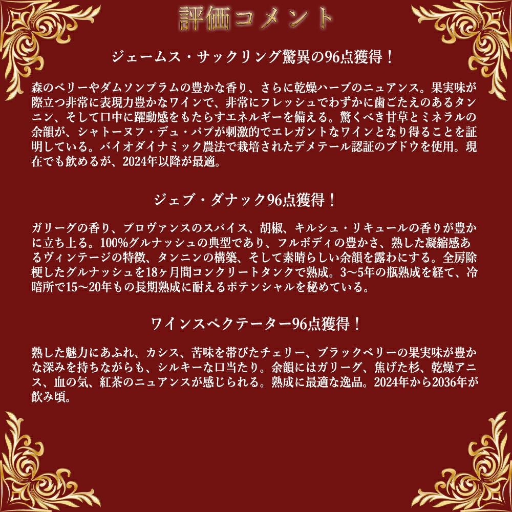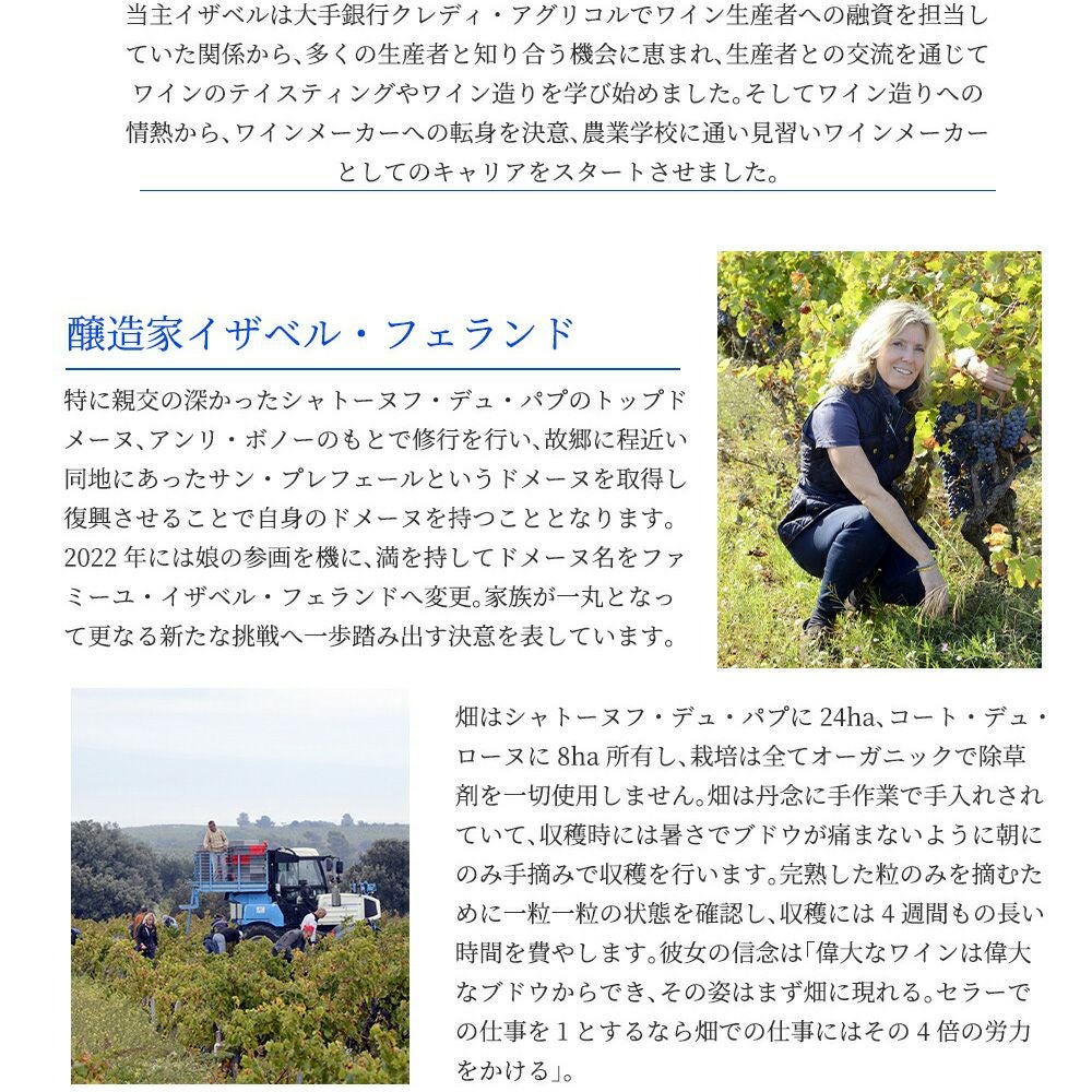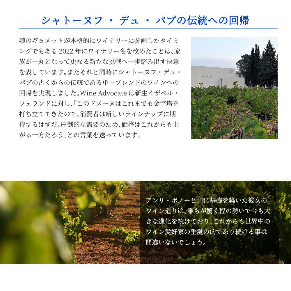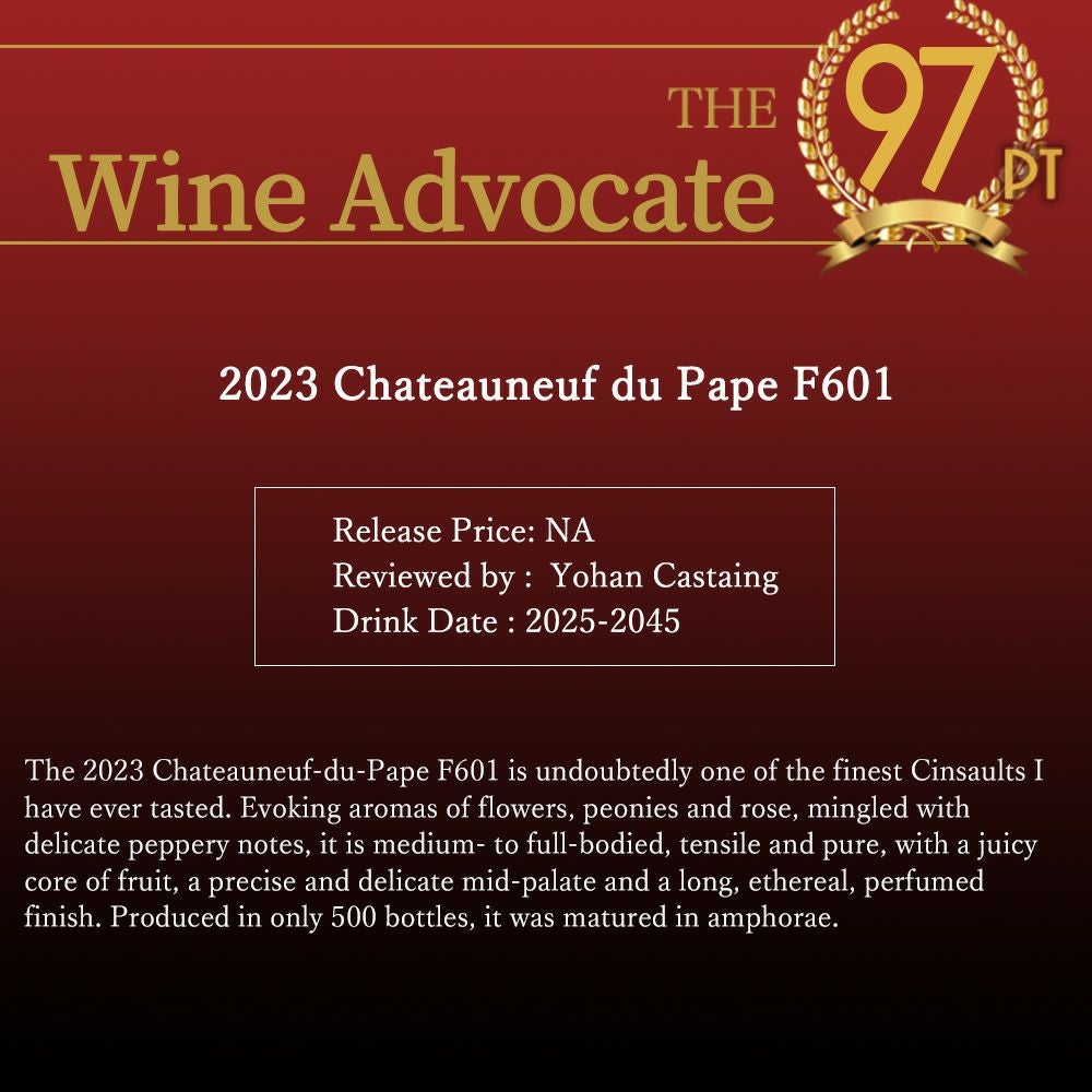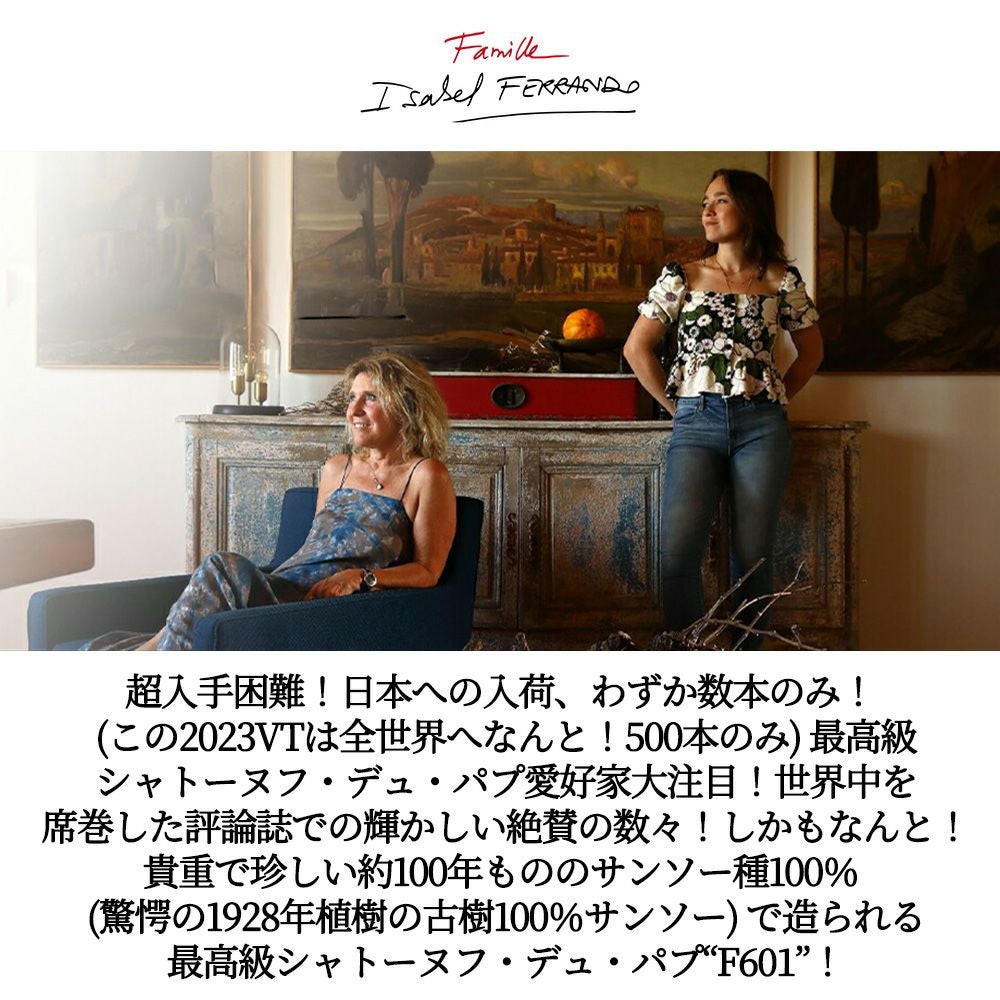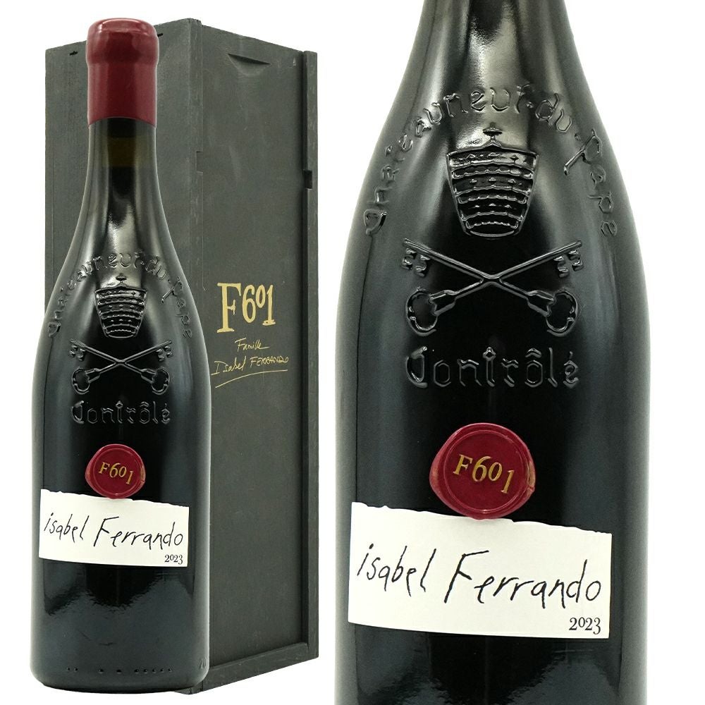 他の画像を見る 【超豪華木箱入り】シャトーヌフ デュ パプ F601 2023 ファミーユ イザベル フェランド(ドメーヌ サン プレフェール)元詰Chateauneuf du Pape F601 2023 Famille Isabel Ferrando 赤ワイン フランス フルボディ 辛口 当店特別価格 ¥ 104,956 税込 在庫切れ 詳細を見る お気に入りに登録する