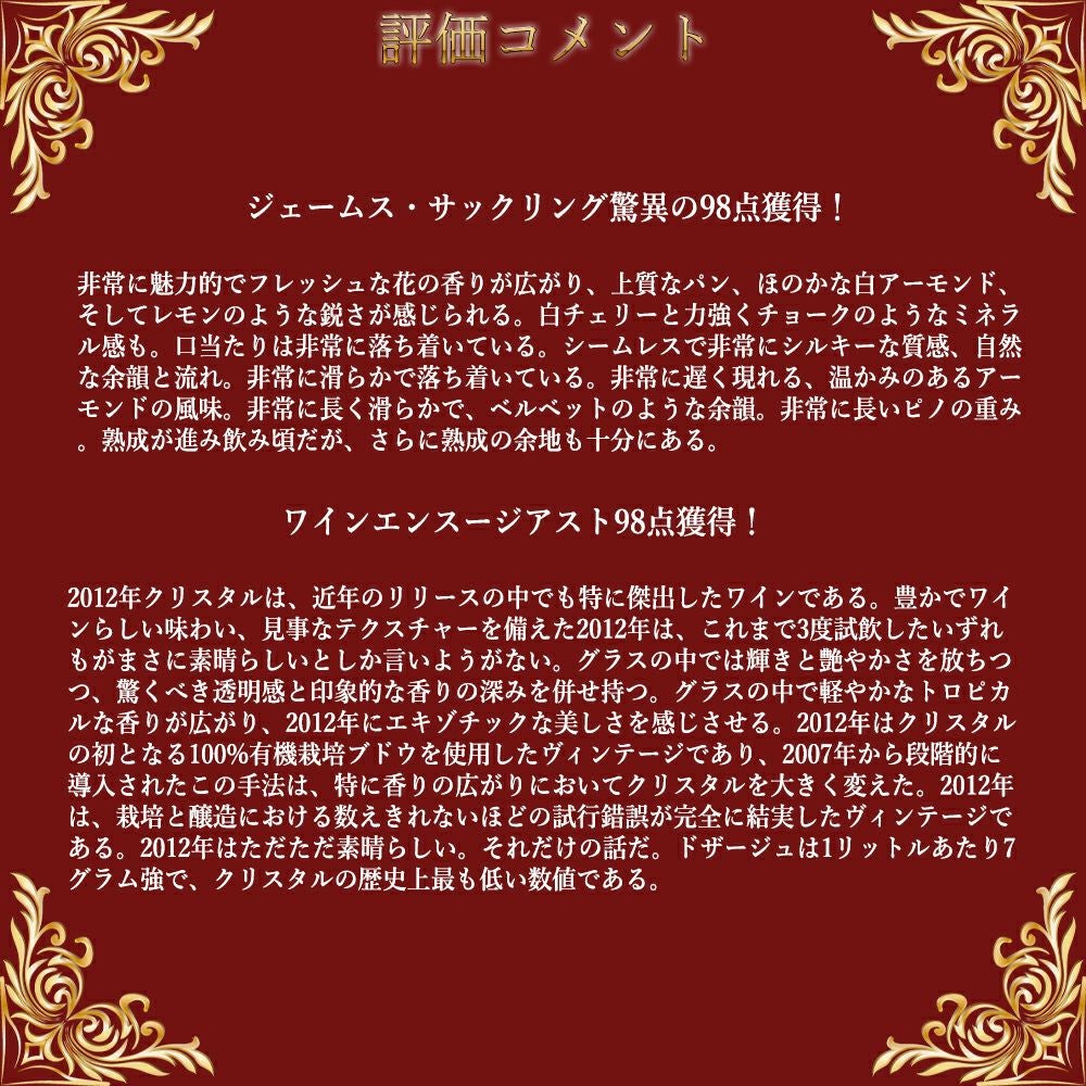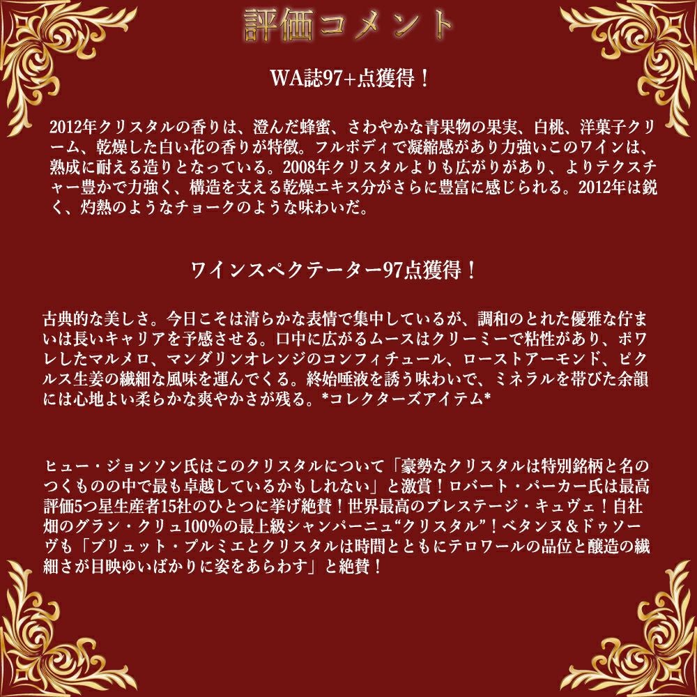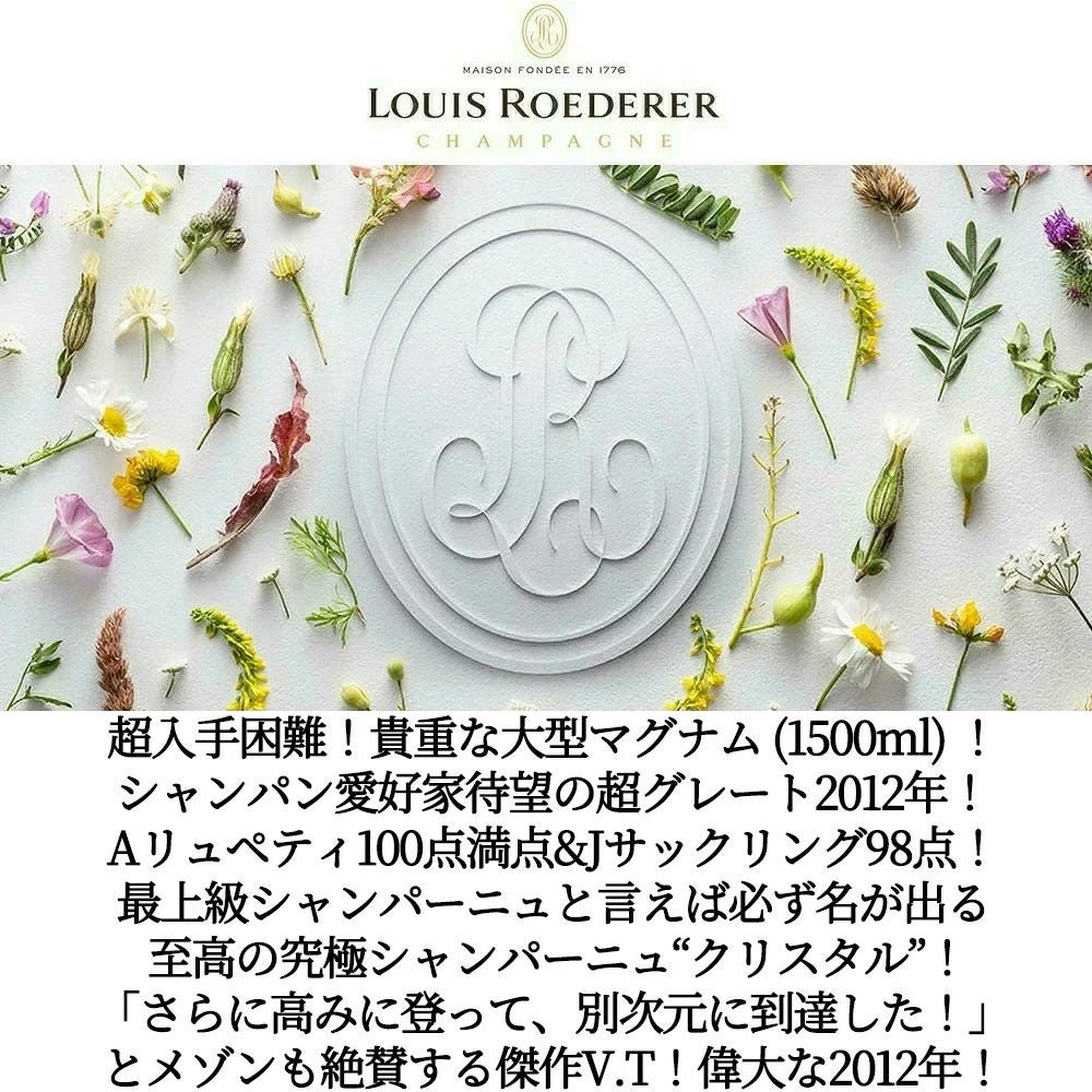 他の画像を見る 【大型マグナム】ルイ ロデレール クリスタル 2012 正規品 シャンパン AOCミレジム シャンパーニュ (JS98点&ヴィノス誌98点)Louis Roederer Champagne Cristal Brut 2012 AOC 白ワイン シャンパン フランス 辛口 当店特別価格 ¥ 104,291 税込 在庫切れ 詳細を見る お気に入りに登録する